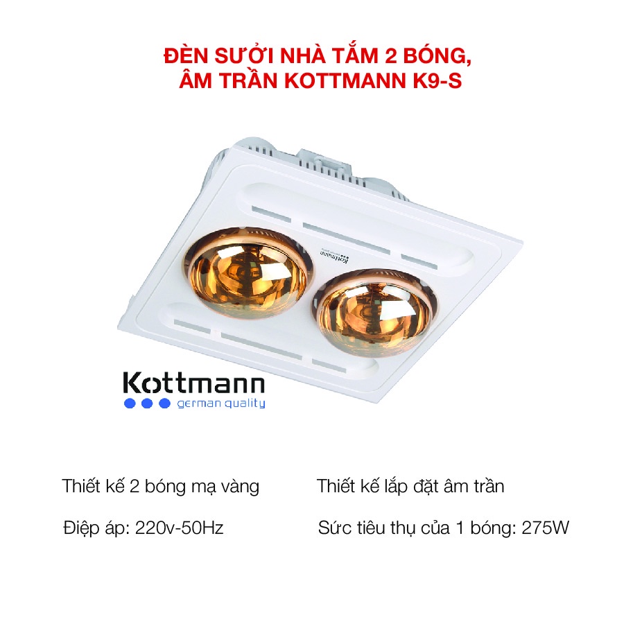 [Mã 155ELSALE giảm 7% đơn 300K] Đèn sưởi nhà tắm 2 bóng, âm trần Kottmann K9-S