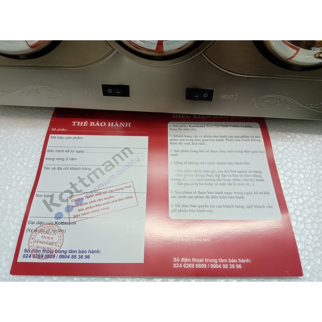 - 2 công tắc điều khiển: Công tắc 1 cho 1 bóng sưởi giữa, công tắc 2 cho 2 bóng sưởi bên phải và trái.