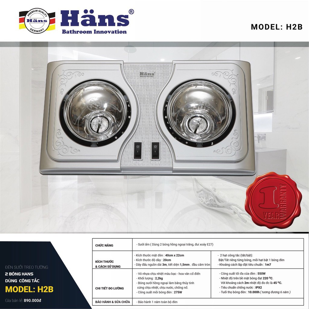 Giới thiệu Đèn sưởi nhà tắm Hans 2 bóng trắng - H2B - Bảo hành 1 năm