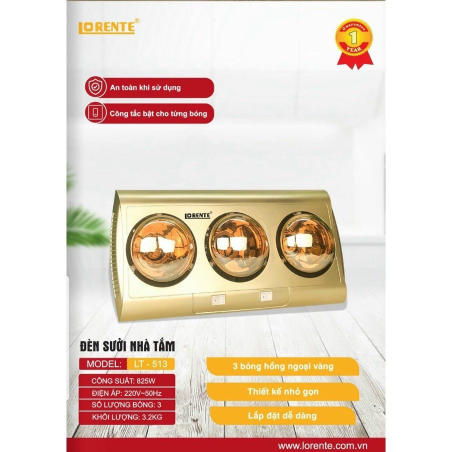 Giới thiệu Đèn Sưởi Nhà Tắm LORENTE 2 bóng -3 bóng công suất 825w , Đèn Sưởi Ấm Nhanh, hàng chính hãng ( bh 24 tháng )