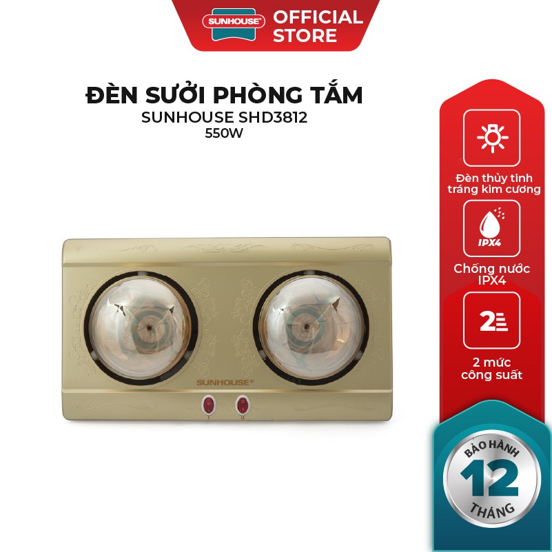 Đèn sưởi nhà tắm SUNHOUSE 2 bóng SHD3812 có hoa văn sang trọng kết hợp với màu vàng nổi bật, là điểm nhấn cho phòng tắm của bạn thêm hiện đại, tiện nghi.