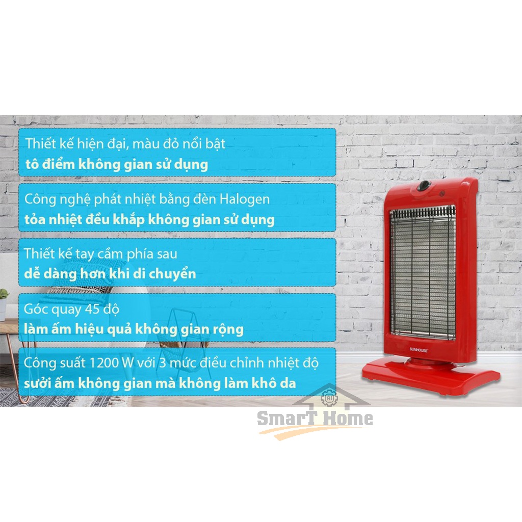 + Sưởi điện 3 bóng halogen SUNHOUSE SHD7016 có thiết kế sang trọng hơn, kiểu dáng hiện đại và bắt mắt, nhỏ gọn tiết kiệm diện tích và phù hợp mọi không gian như phòng khách, phòng ngủ,...