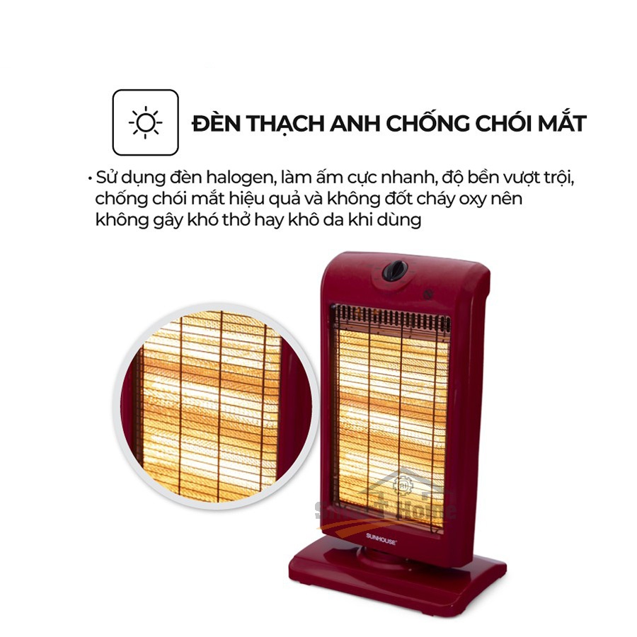 + Làm ấm cực nhanh, không gây khô da SUNHOUSE SHD7016 sử dụng đèn halogen, làm ấm cực nhanh, độ bền vượt trội, chống chói mắt hiệu quả và không đốt cháy oxy nên không gây khó thở hay khô da khi dùng.