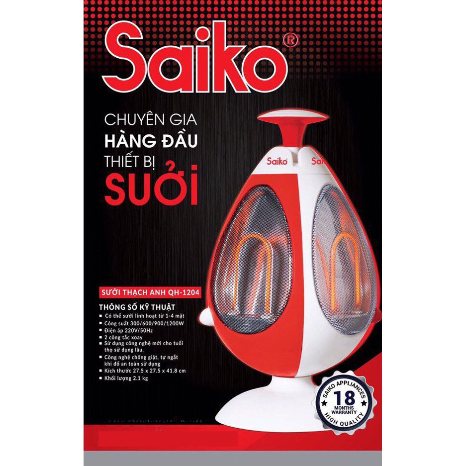 Đèn sưởi thạch anh SAIKO QH-1204 bảo hành 18 thángĐèn sưởi thạch anh SAIKO QH-1204 là mẫu sưởi mới nhất năm nay được thiết kế với kiểu dáng hiện đại, độc đáo, mới lạ với bốn mặt sưởi để lại nhiều ấn tượng khi lần đầu nhìn thấy.