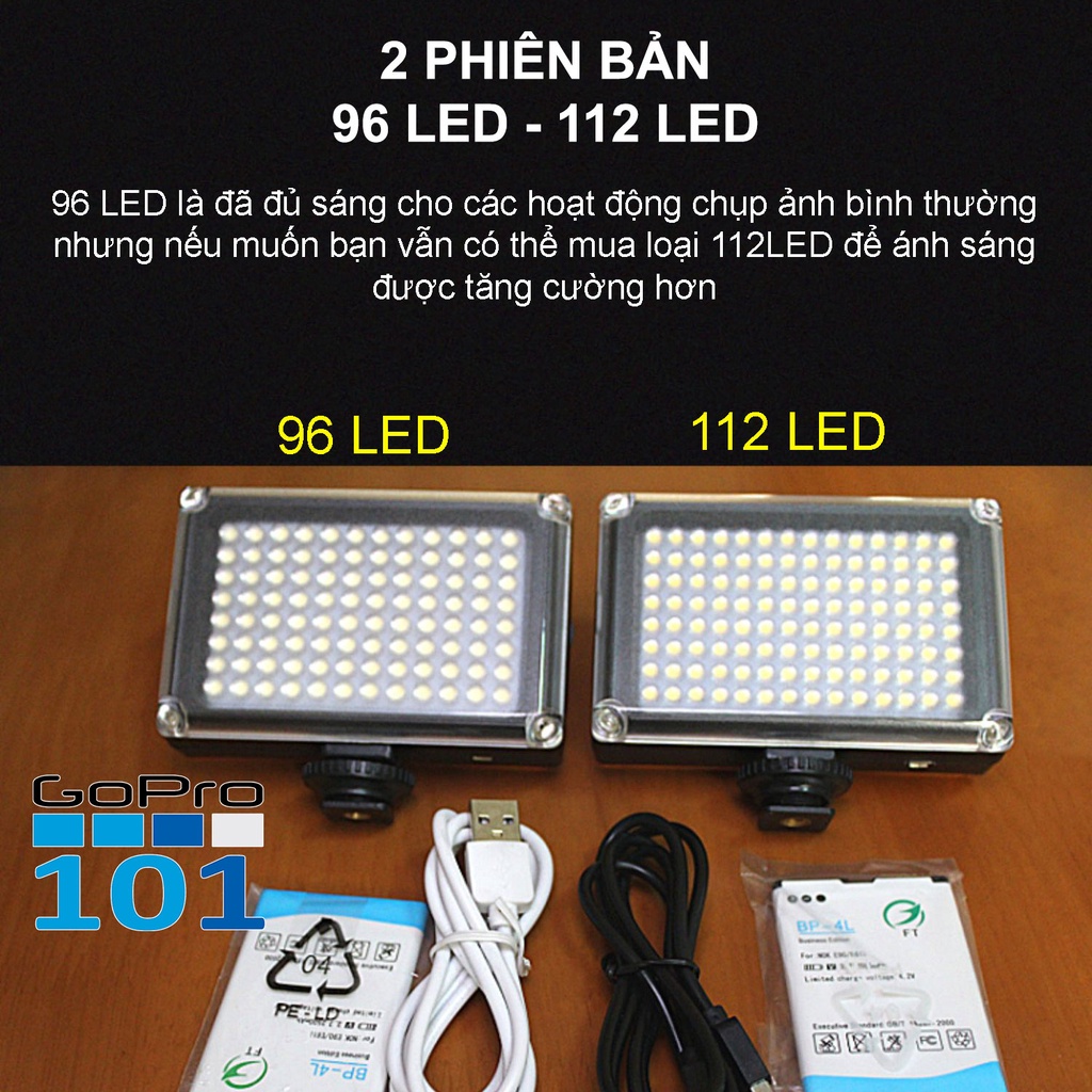 Đèn trợ sáng quay video camera, GoPro 96 LED 112 LED kèm 6 filter màu hỗ trợ chụp ảnh tự sướng tiện lợi - GoPro101*Bộ sản phẩm gồm : 1 thân đèn 96 hoặc 112 led tuỳ chọn, 2 filter trắng và vàng, 6 miếng filter nhựa, cáp sạc. (phân loại nào có kèm pin các bạn chọn kỹ nhé). Sản phẩm mới 100% và chất lượng cao, không kèm gậy như ảnh mô tả