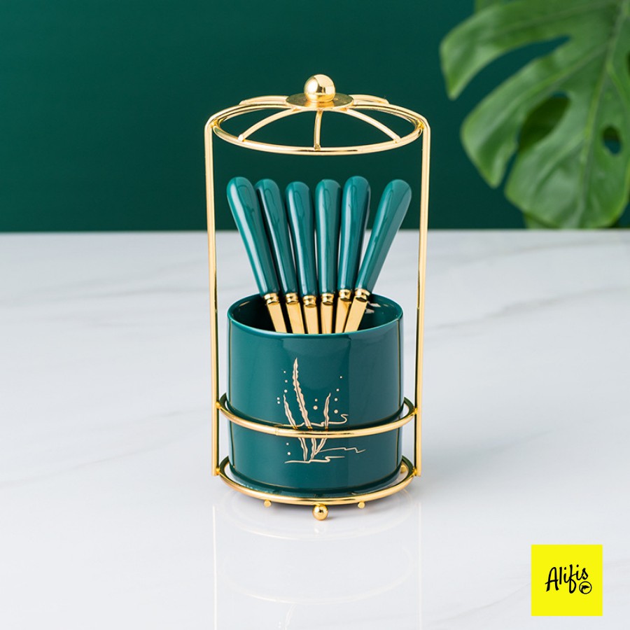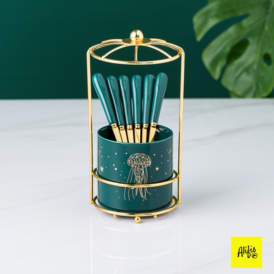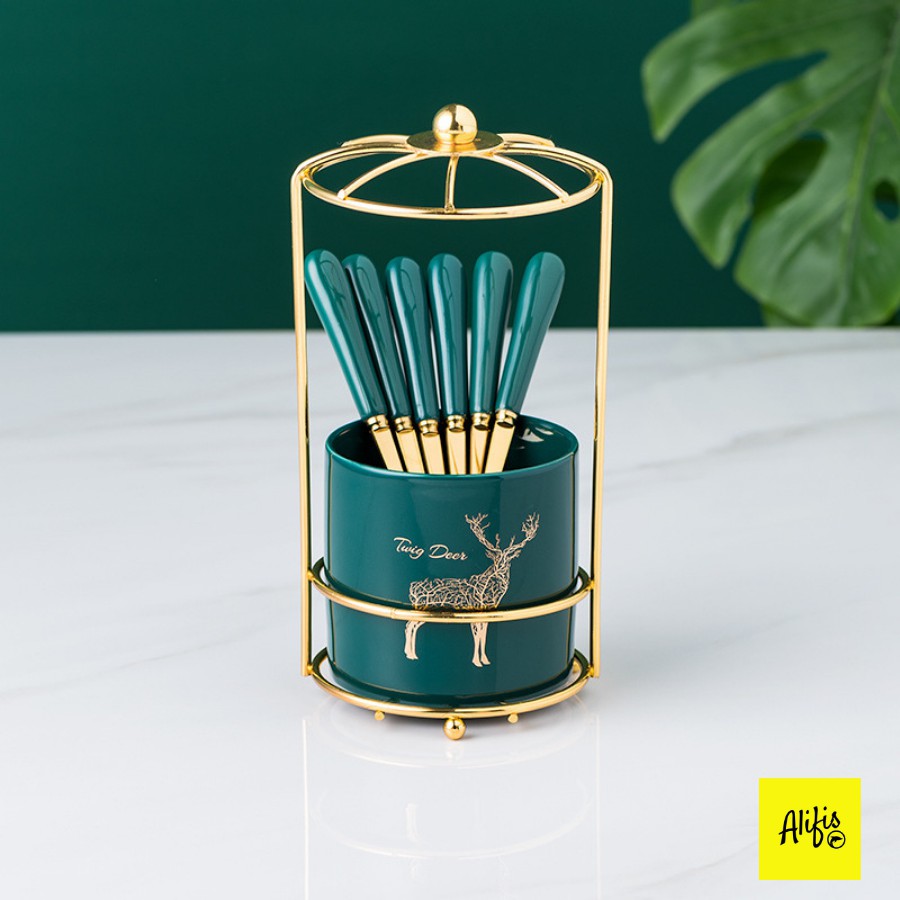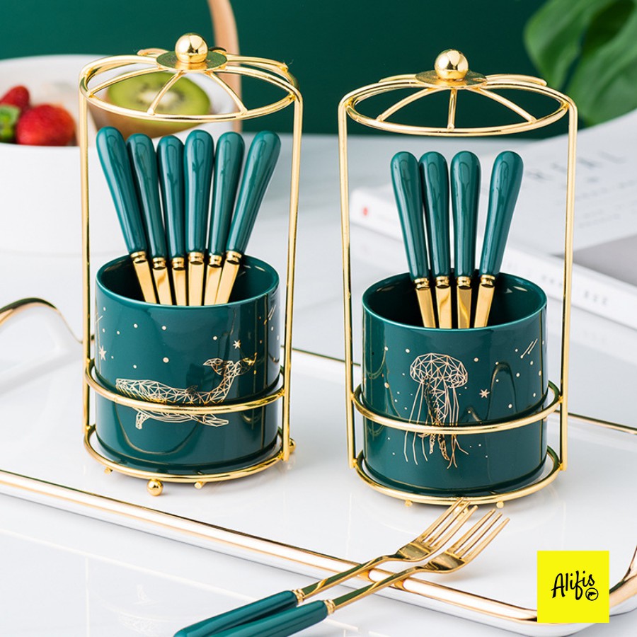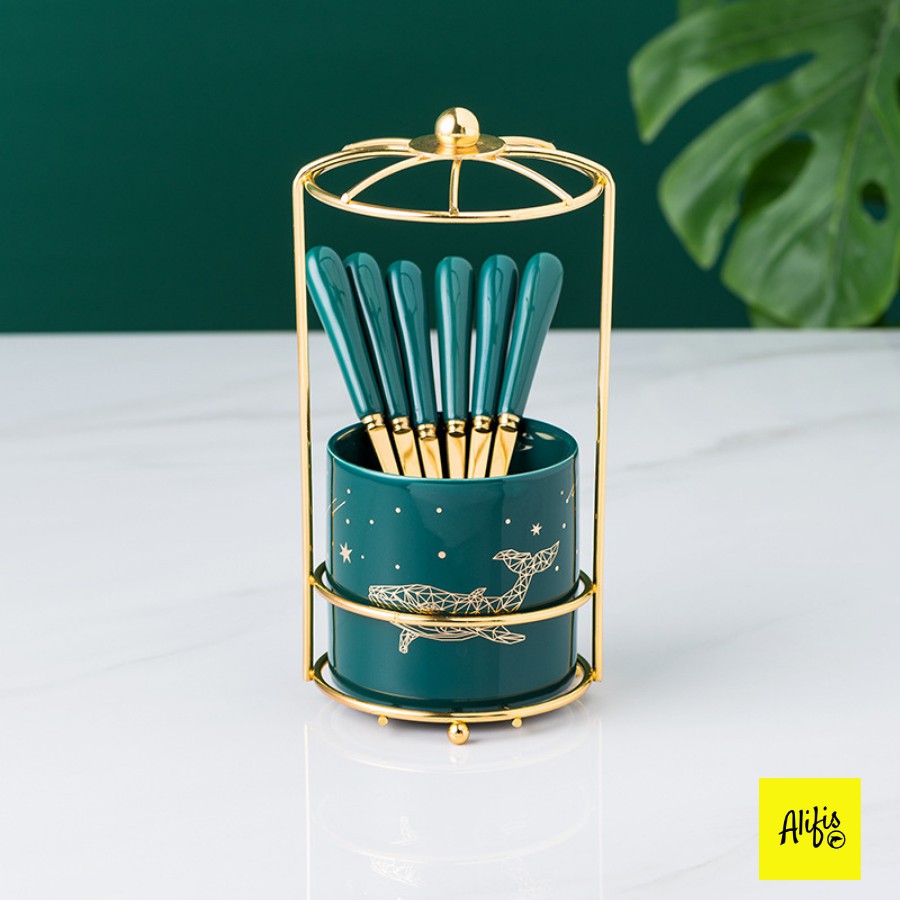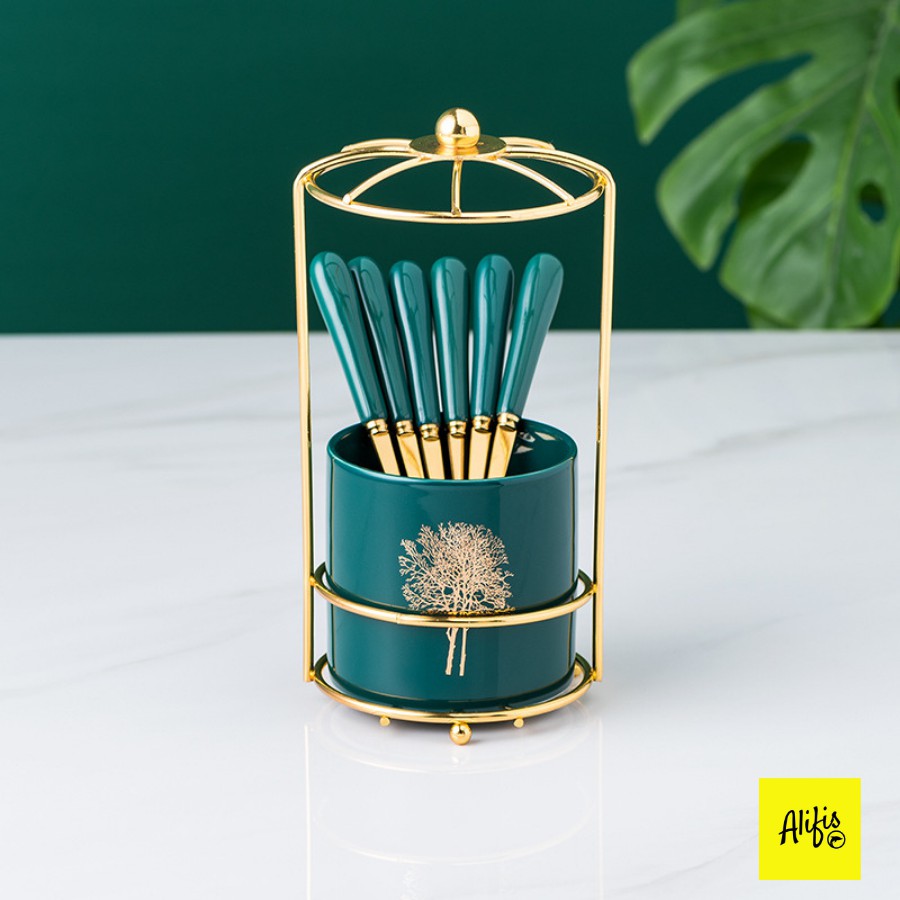Nhà cửa & Đời sống > Bộ đồ bàn ăn > Dĩa || Dĩa ăn hoa quả, nĩa ăn trái cây kèm lọ sứ màu xanh cổ vịt – phong cách Bắc Âu sang trọngCòn hàng