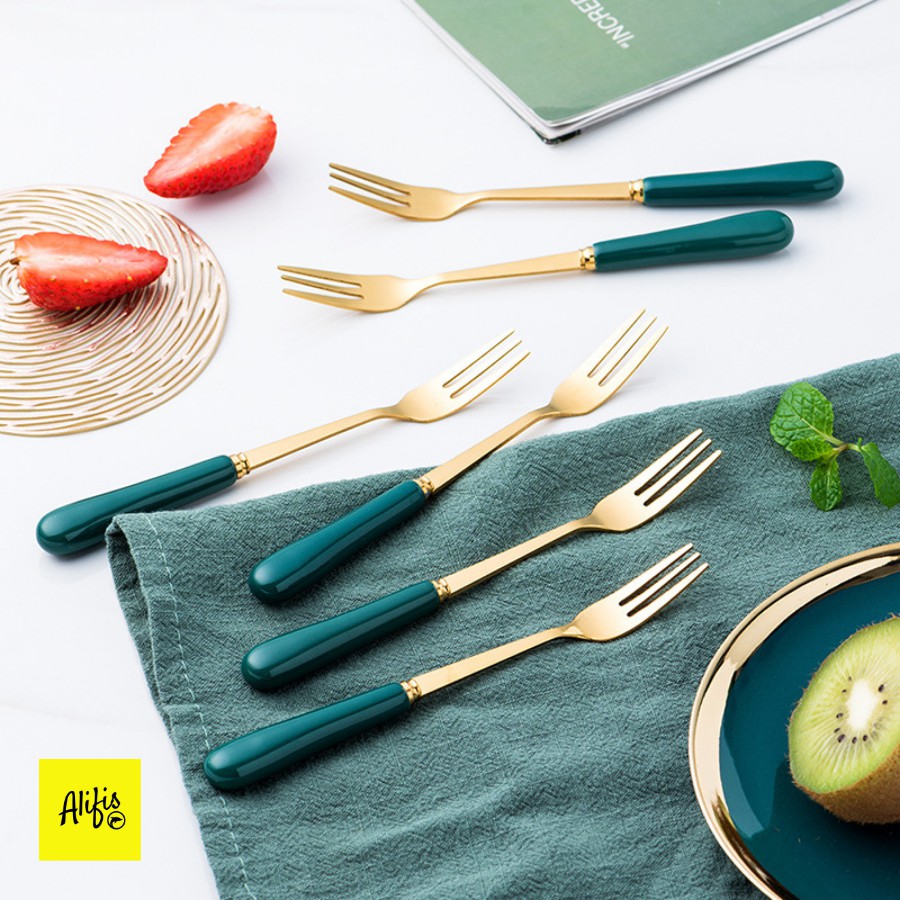 + Nĩa ăn hoa quả làm từ inox không gỉ cao cấp màu vàng ánh kim siêu sang.