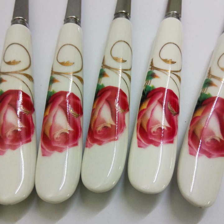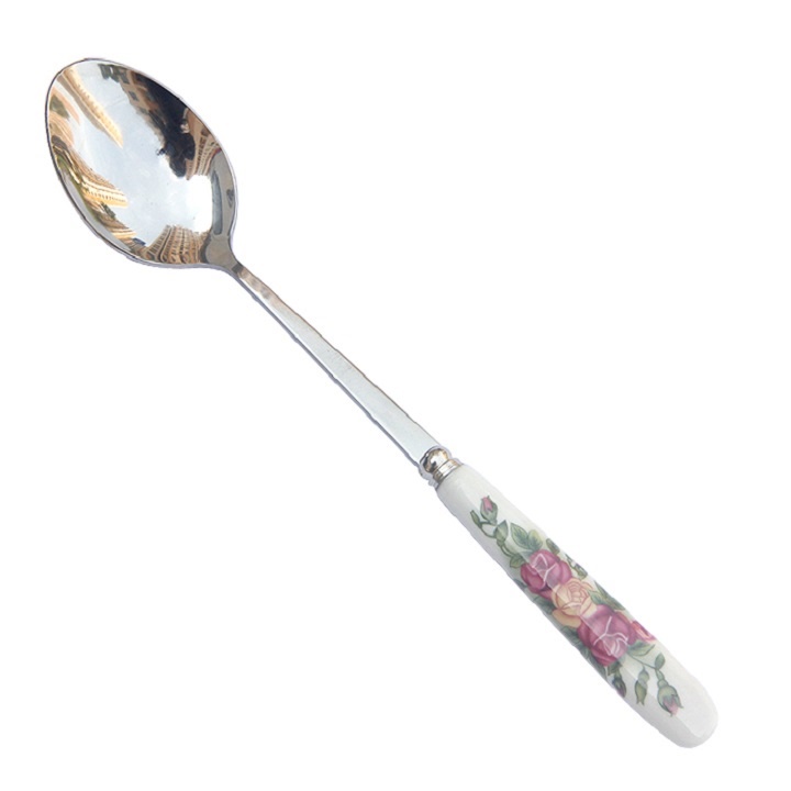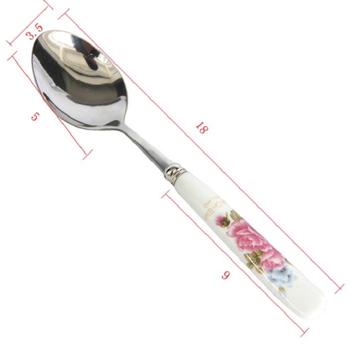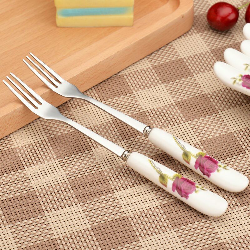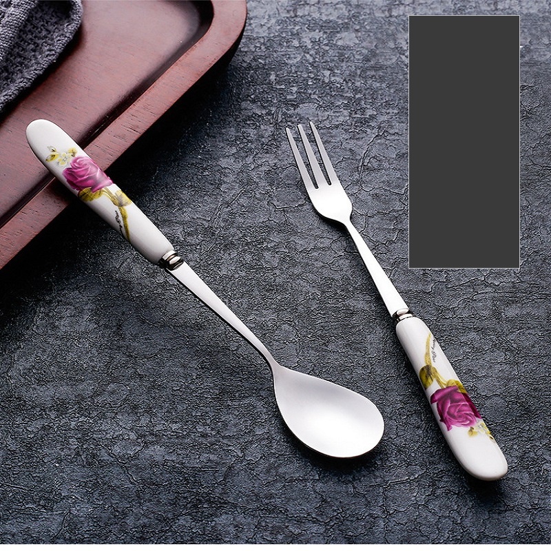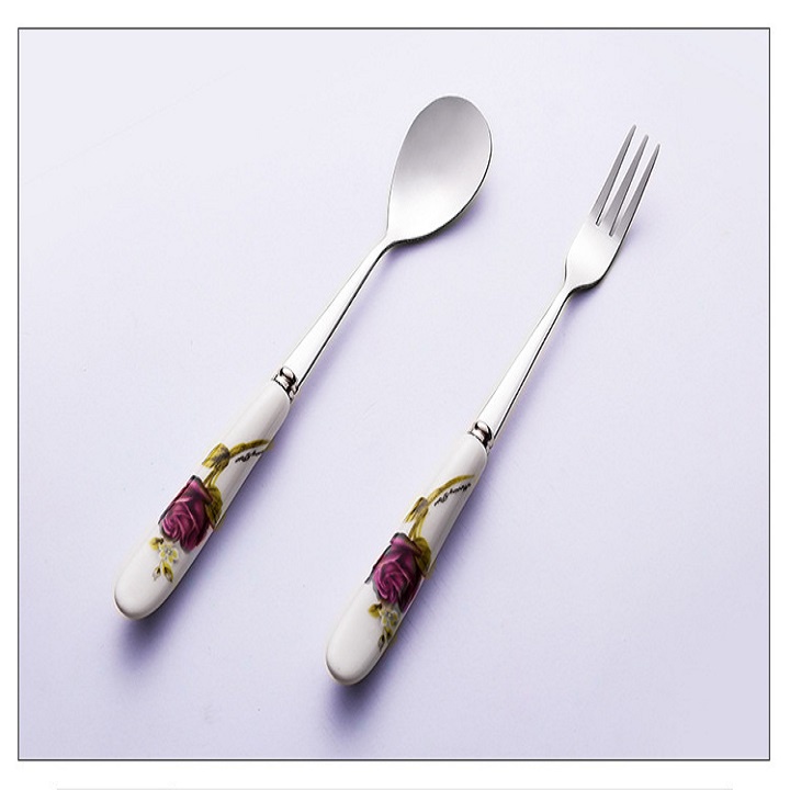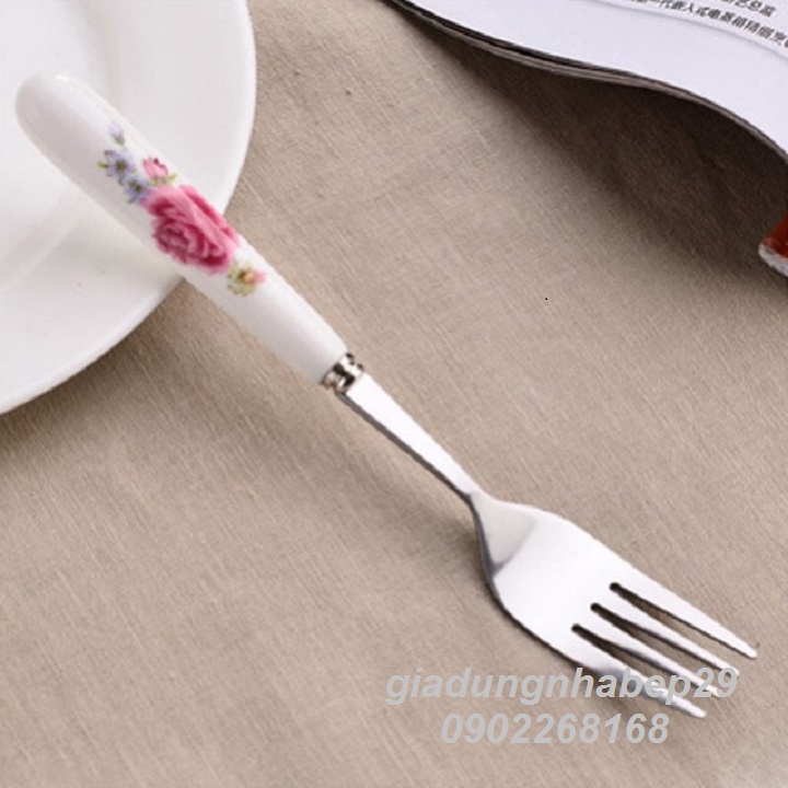 Dĩa ăn hoa quả thìa cà phê cán sứ hoa hồng inox sáng bóng bền đẹp