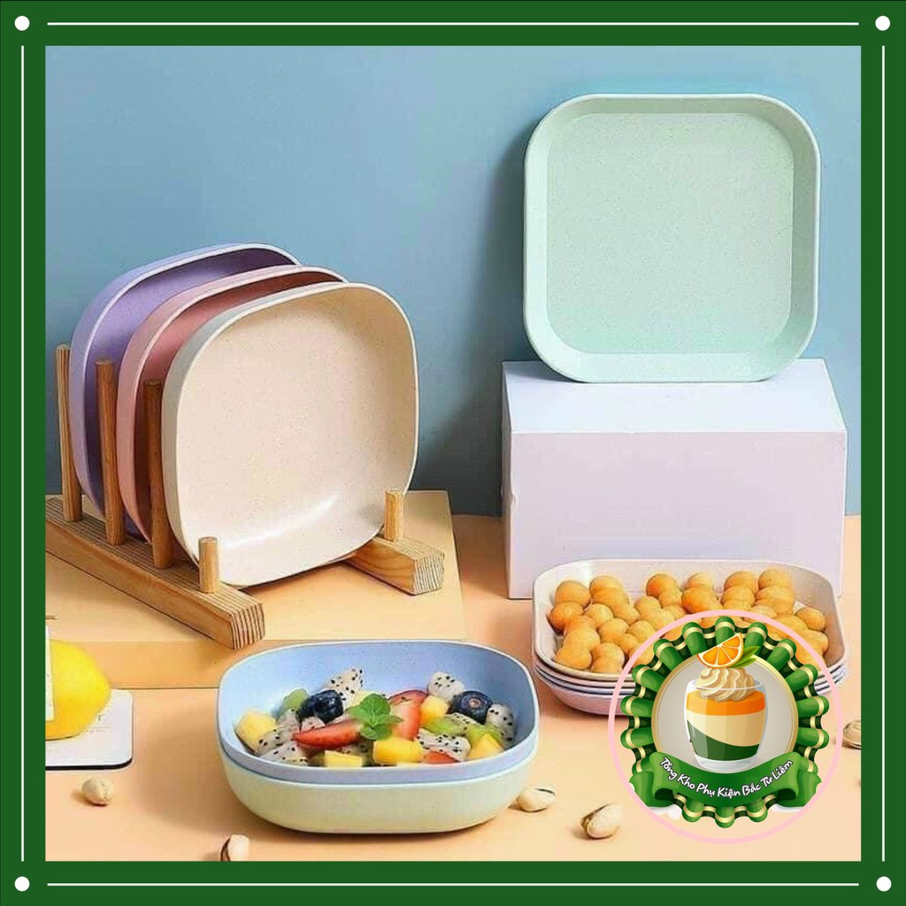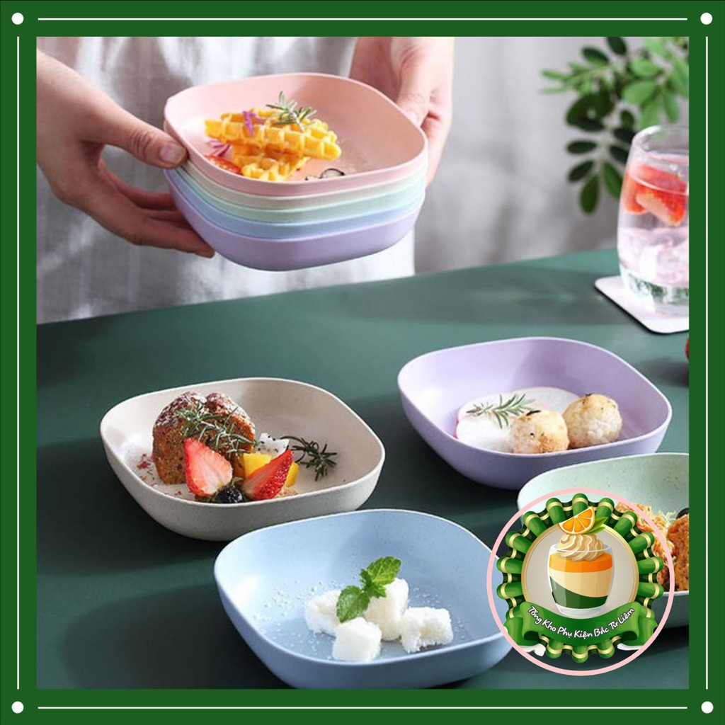 màu pastal siêu xinh, đĩa lúa mạch hình vuông đựng thức ăn, hoa quả, bánh kẹo