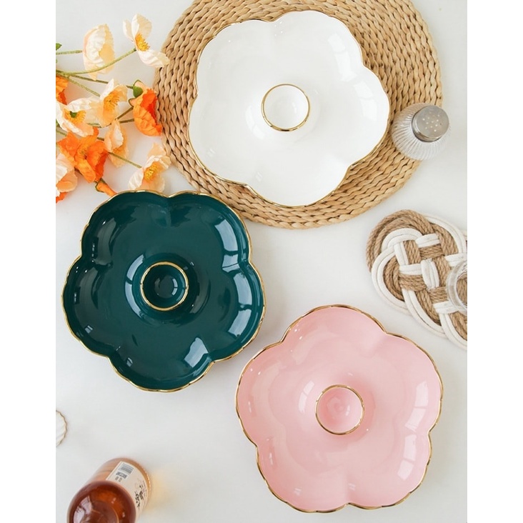Nhà cửa & Đời sống > Bộ đồ bàn ăn > Dĩa || Đĩa bông hoa, khay sứ kèm đĩa chấm viền vàng - Đựng hoa quả, thức ăn tiện lợiCòn hàng