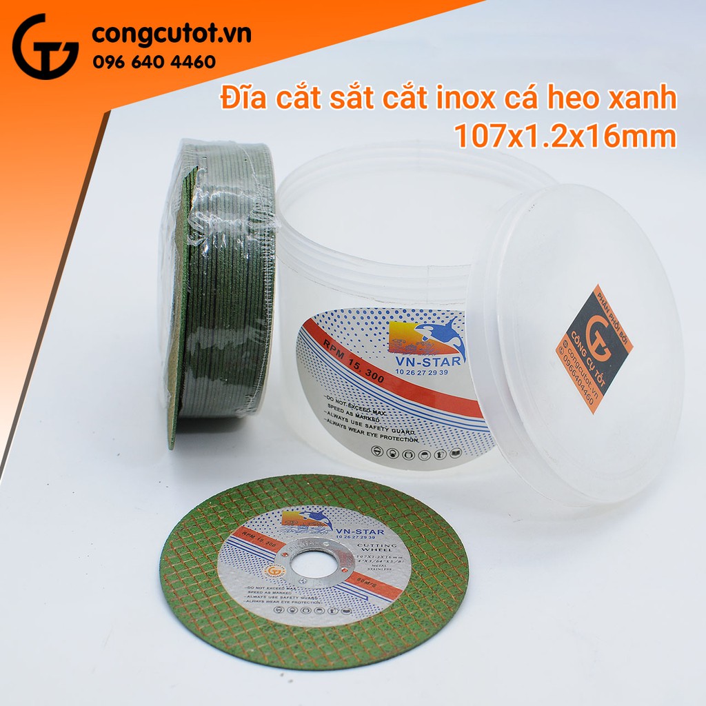 Đĩa cắt sắt cắt inox nhãn hiệu cá heo xanh phù hợp với các máy cắt cầm tay đường kính 107mm, dày 1.2mm với khả năng cắt bén, lâu mònChắc bạn không còn xa lạ với những chiếc đĩa cắt, hay còn gọi là đá cắt dùng để cắt sắt, inox, nhôm, đồng với máy cắt cầm tay. Thương hiệu đá cắt cá heo xanh với khả năng cắt sắt, cắt inox nhanh bén và lâu mòn đá đã được nhiều người thợ chuyên nghiệp sử dụng