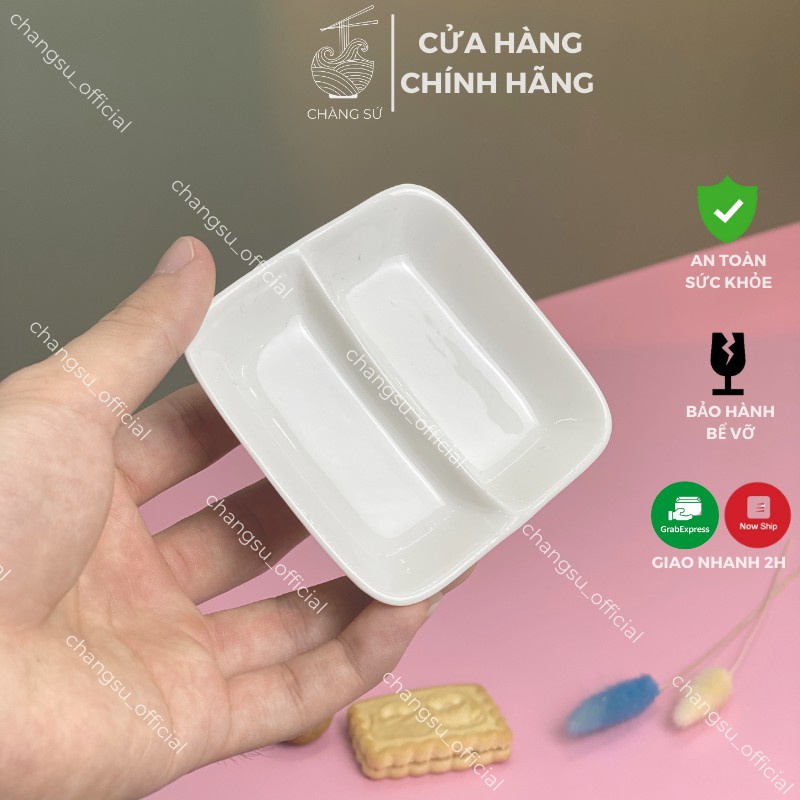 Đĩa chấm 2 ngăn trắng trơn đựng gia vị, tương cà, muối tiêu, xì dầu, nước mắm - Chén gia vị chia ngăn sứ Minh Châu