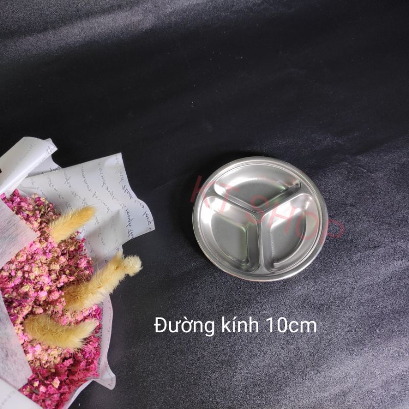 Chất liệu thép không gỉ an toàn vệ sinh thực phẩmGồm 2 phân loại là dĩa 2 ngăn và 3 ngăn với 3 kích thước 10cm, 12 cm và 14 cm
