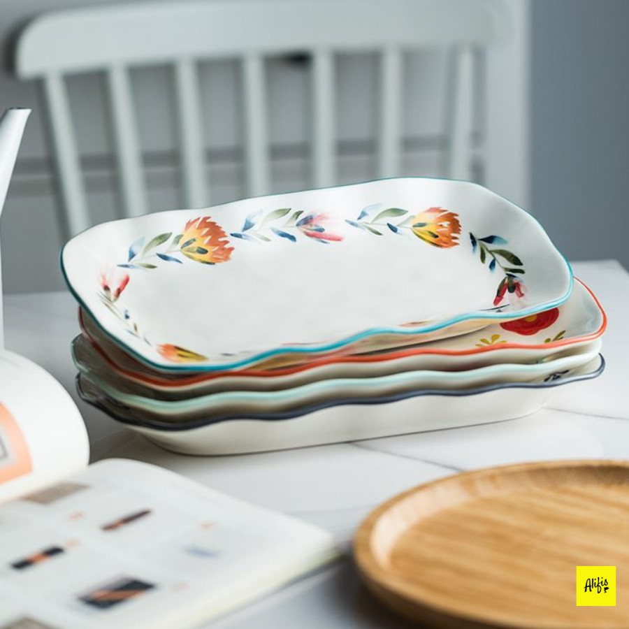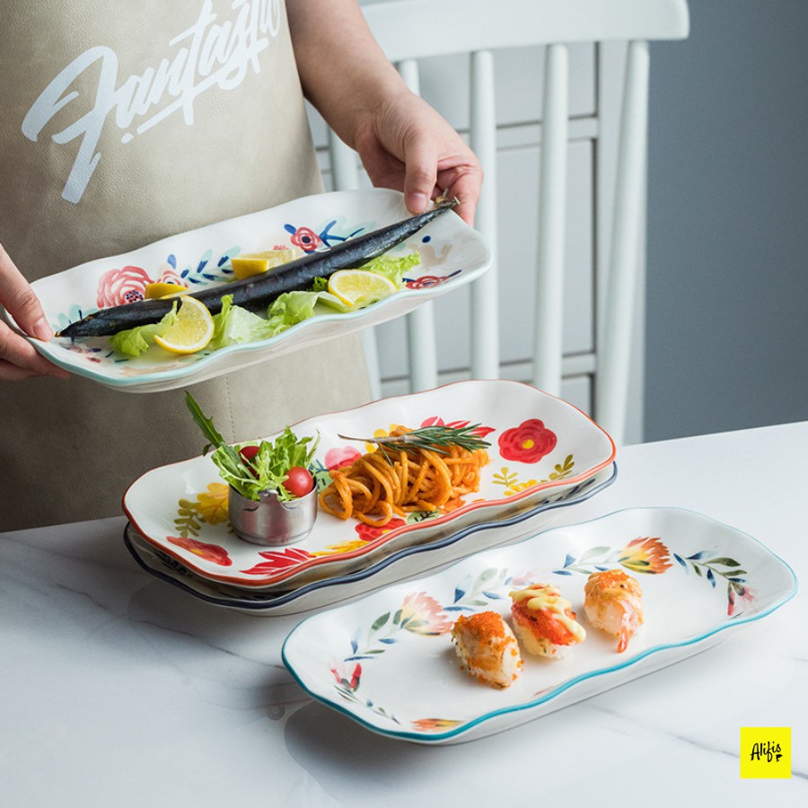 Nhà cửa & Đời sống > Bộ đồ bàn ăn > Dĩa || Đĩa chữ nhật bằng sứ họa tiết hoa quả mùa xuân – Dùng cho bàn ăn và decor [Hàng sẵn]Còn hàng