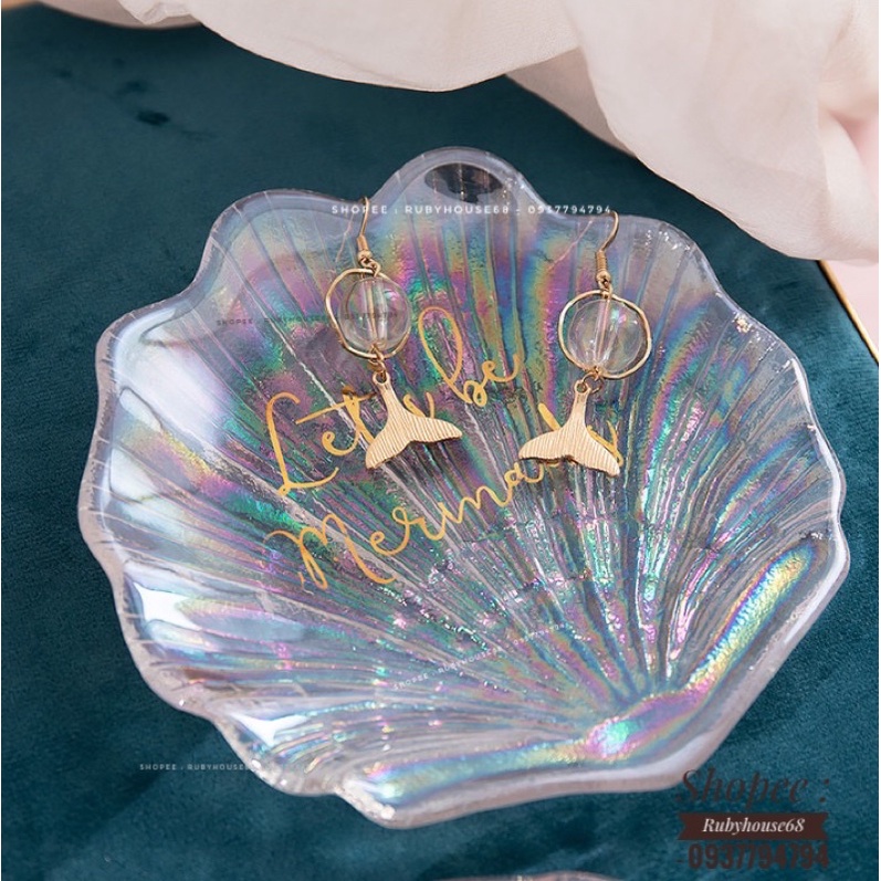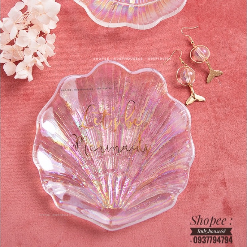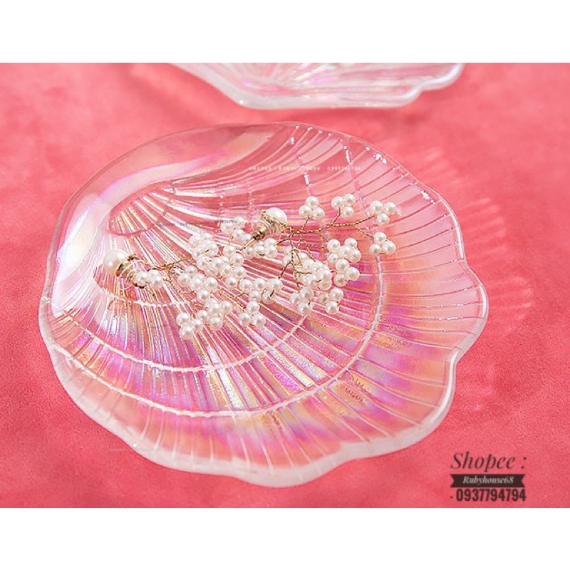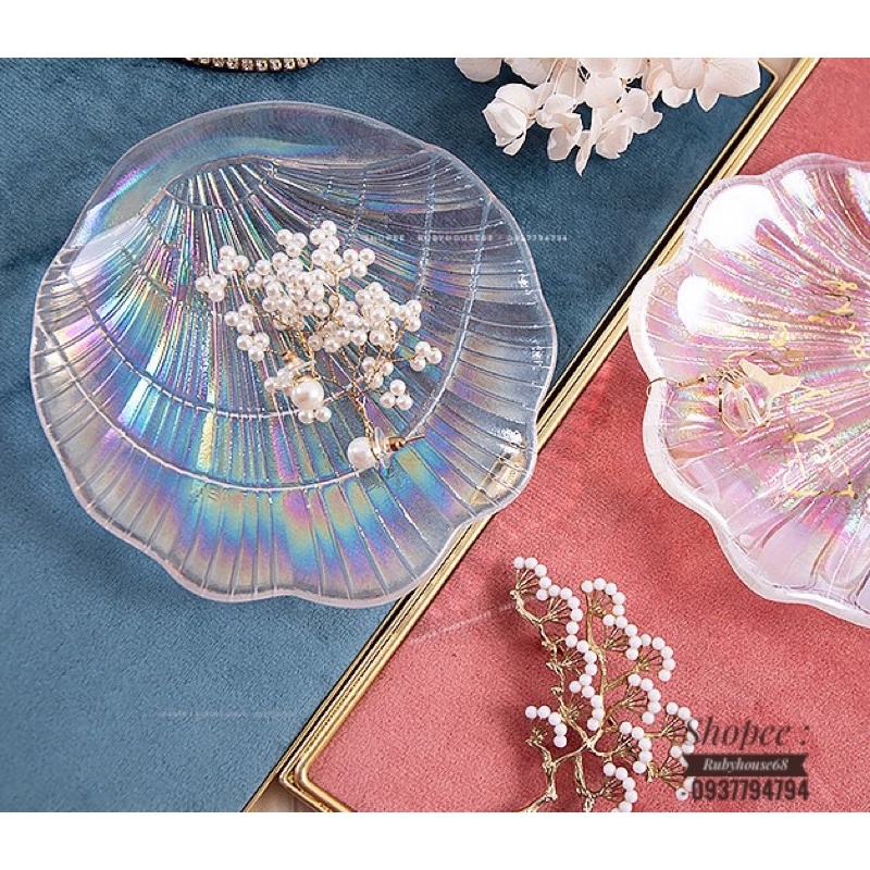 Đĩa chụp ảnh trang sức decor shop phụ kiện- Đĩa hình vỏ sò , chất liệu thuỷ tinh màu óng ánh như xà cừ , có 2 mẫu in chữ hoặc ko in