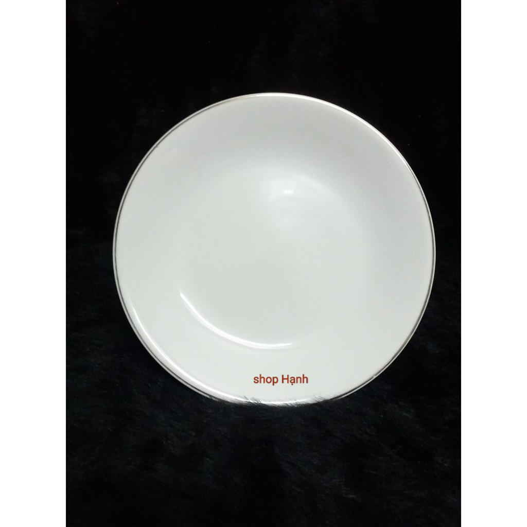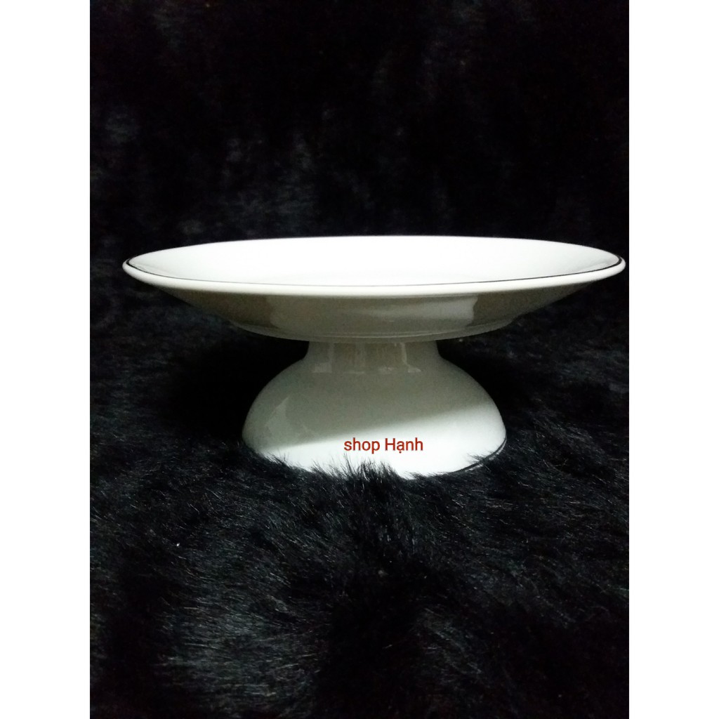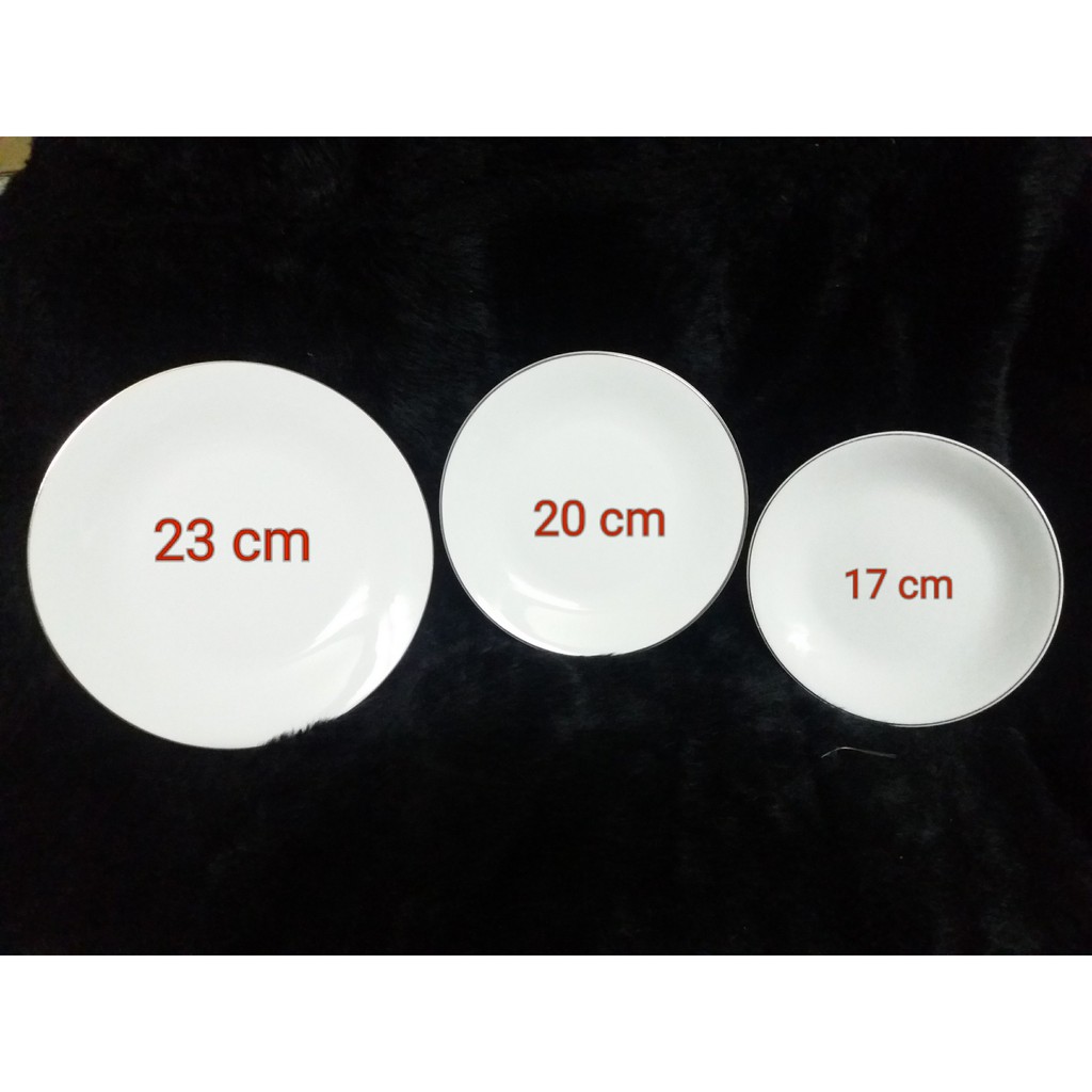 Dĩa đá trắng có size 17 cm, 20 cm và 23 cmChất liệu sứ trắng trơn, không có hoa văn, chỉ có nét viền vàng trên dĩa.