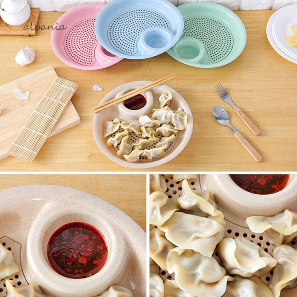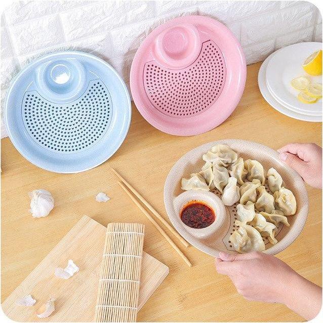 Đĩa đựng thức ăn có khay nước chấm tiện lợi-Chiếc đĩa “3 trong 1” hình tròn với một khay nhỏ và tấm nhựa mỏng với nhiều lỗ thoát nước .