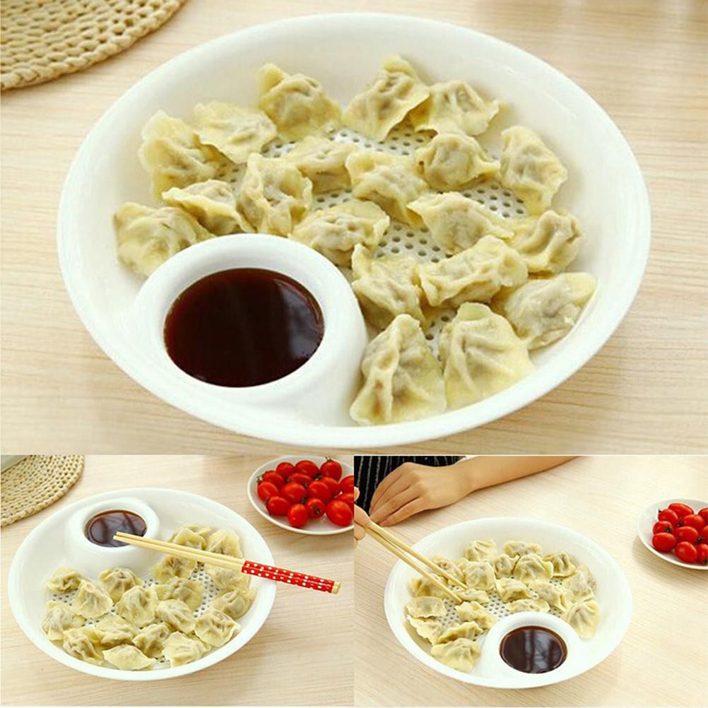 - Chiếc đĩa “3 trong 1” hình tròn với một khay nhỏ và tấm nhựa mỏng với nhiều lỗ thoát nước .- Bạn có thể thưởng thức các món chiên, hấp,… mà không cần chuẩn bị thêm chén đựng nước chấm.