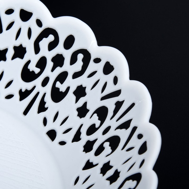 – Viền đĩa được thiết kế với những đường nét hoa văn tinh tế, kết hợp với tông màu trắng thanh lịch