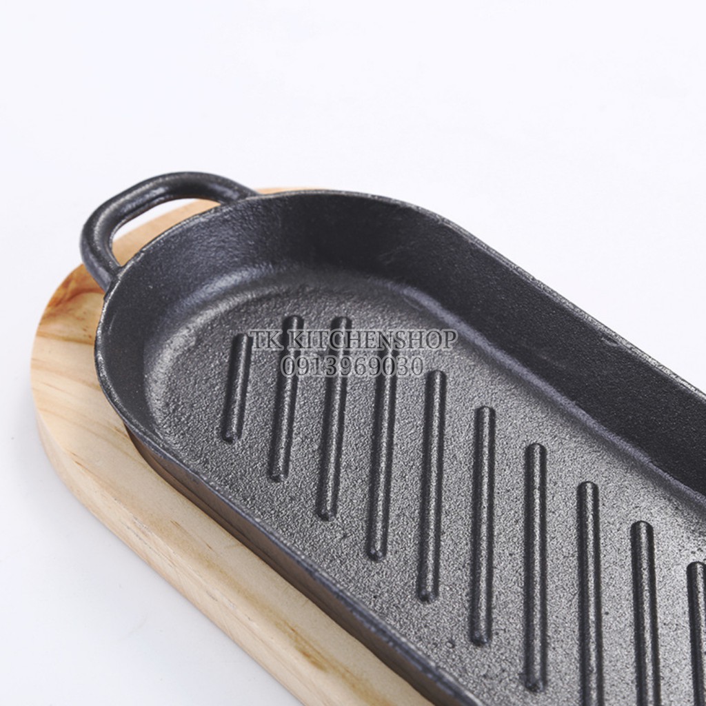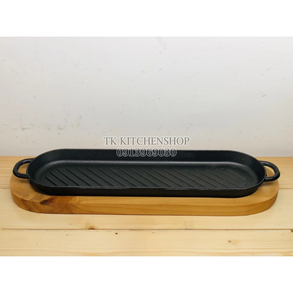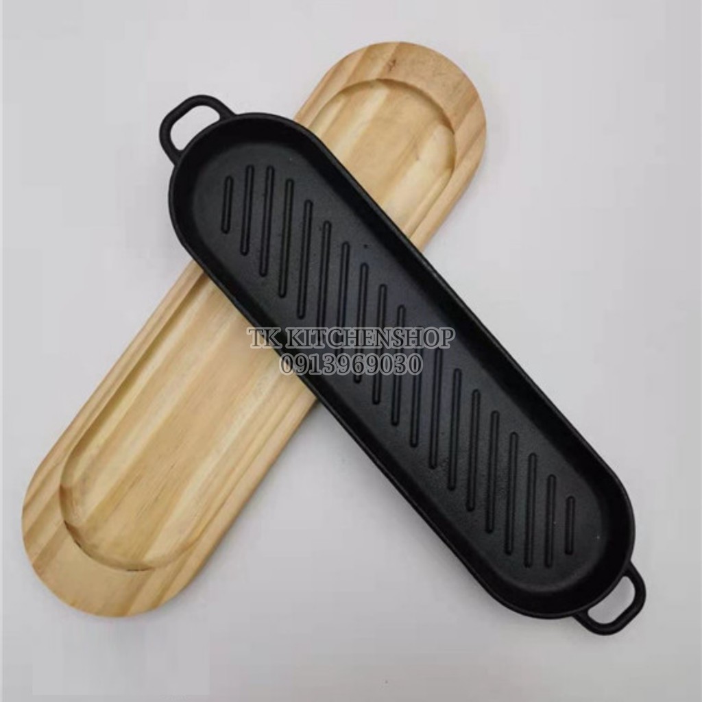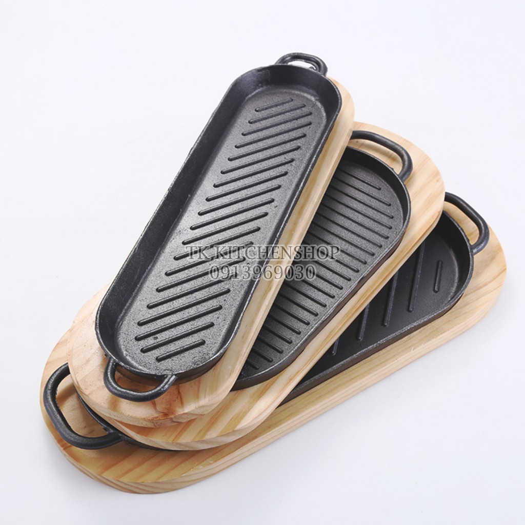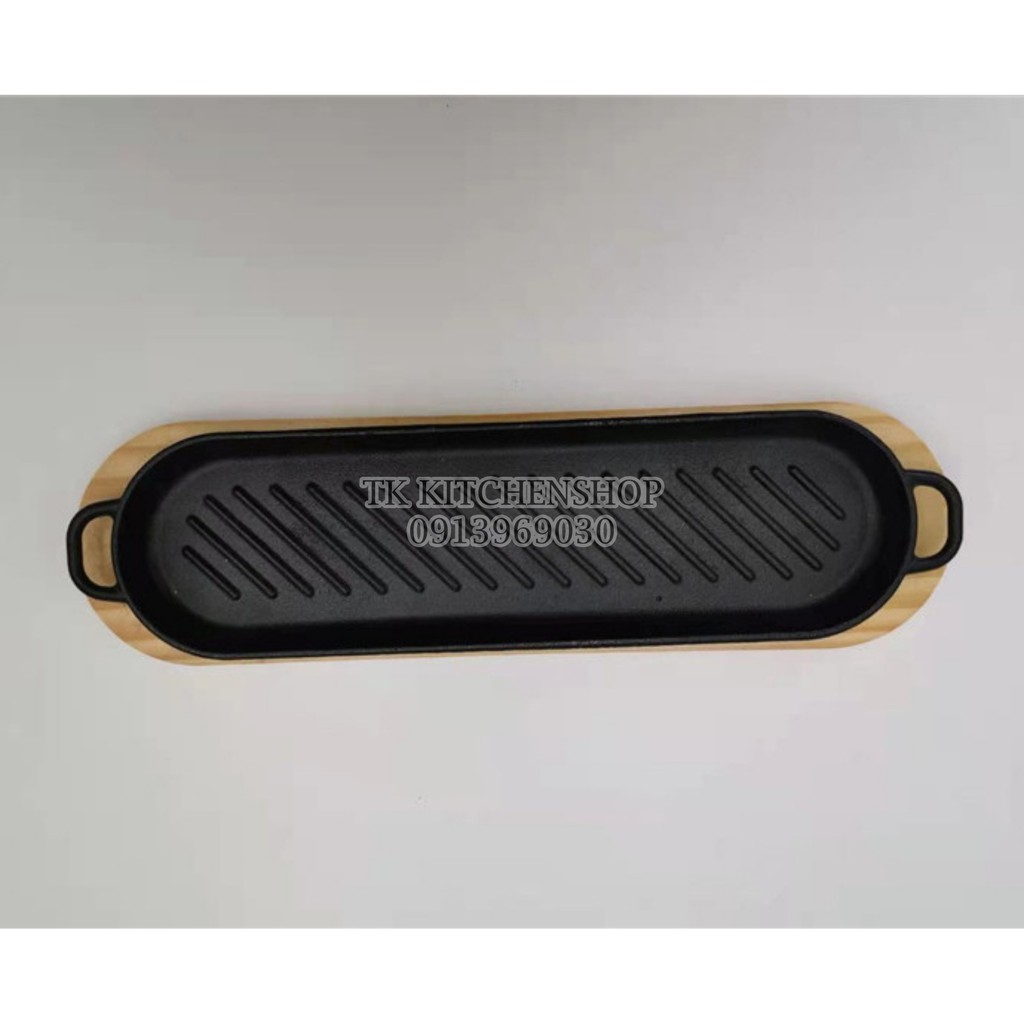 Đĩa gang chống dính chữ nhật tròn cạnh có quai hai bên và đế gỗ KT42cm x 10.7cm