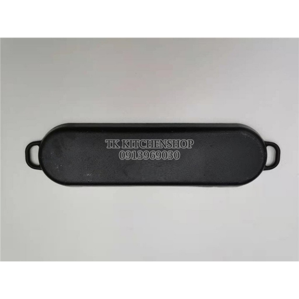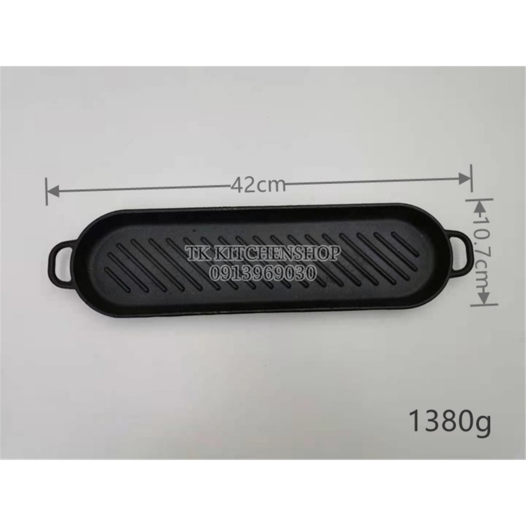 Giới thiệu Đĩa gang chống dính chữ nhật tròn cạnh có quai hai bên và đế gỗ KT42cm x 10.7cm