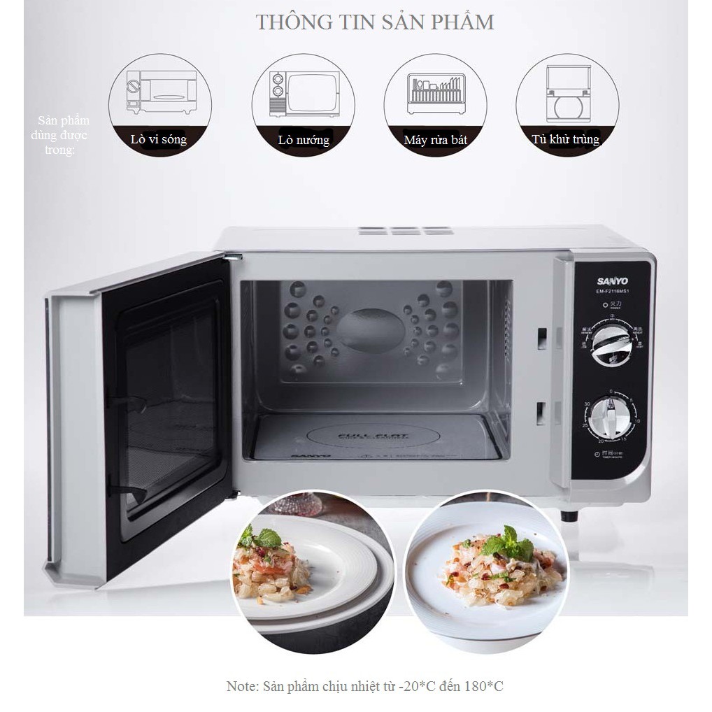 Đĩa có thể dùng trong lò nướng, lò vi sóng, máy rửa bát, tủ khử trùng nhiệt độ dao động -20*C -> 180*C