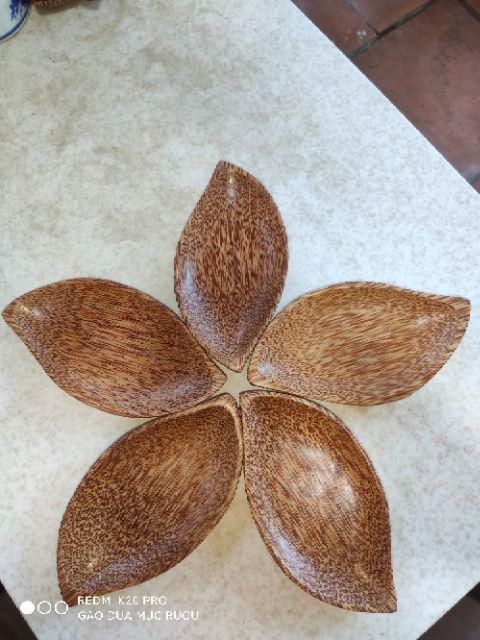 Dĩa gỗ dừa hình chiếc lá.Có thể ghép lại với nhau tạo hình cánh hoa.