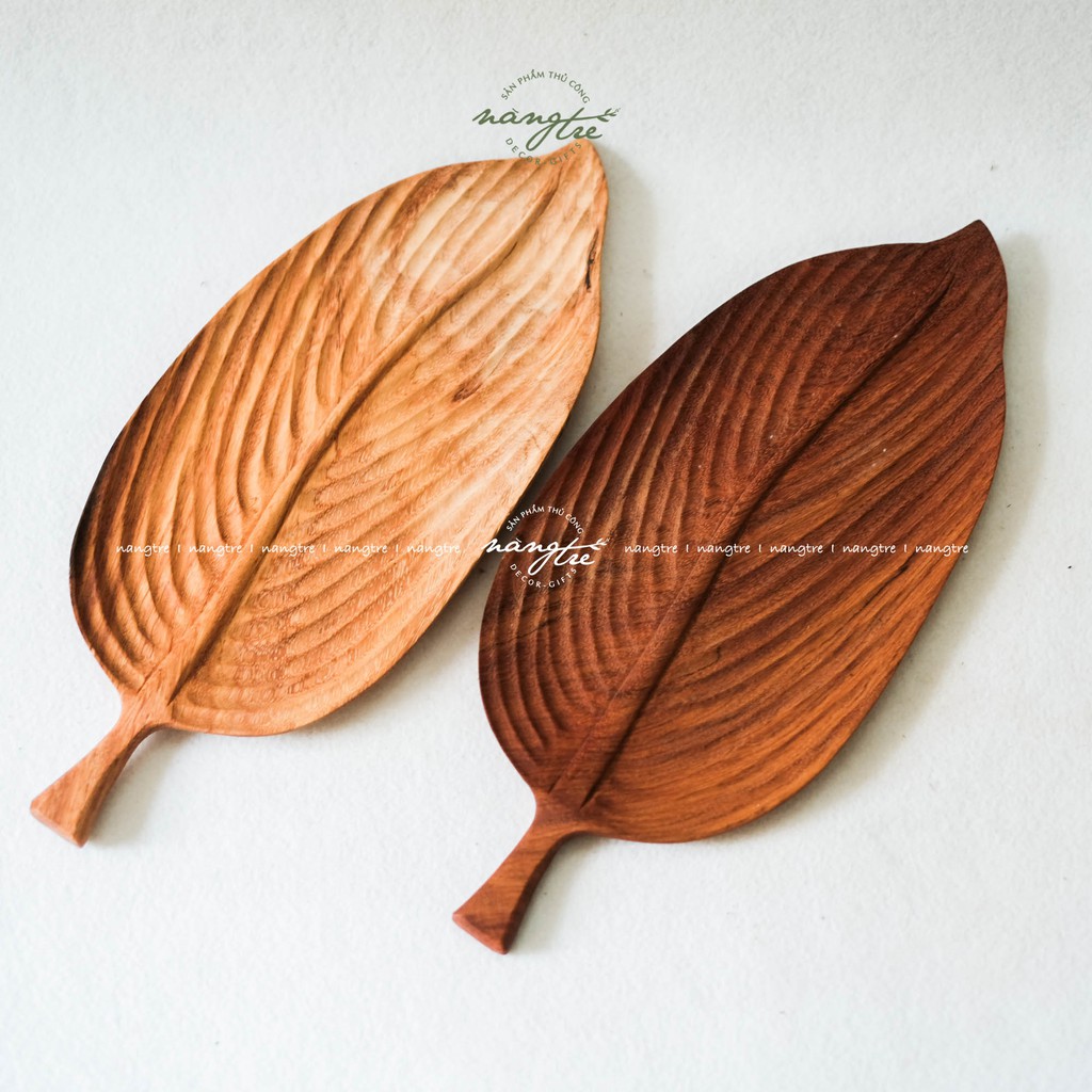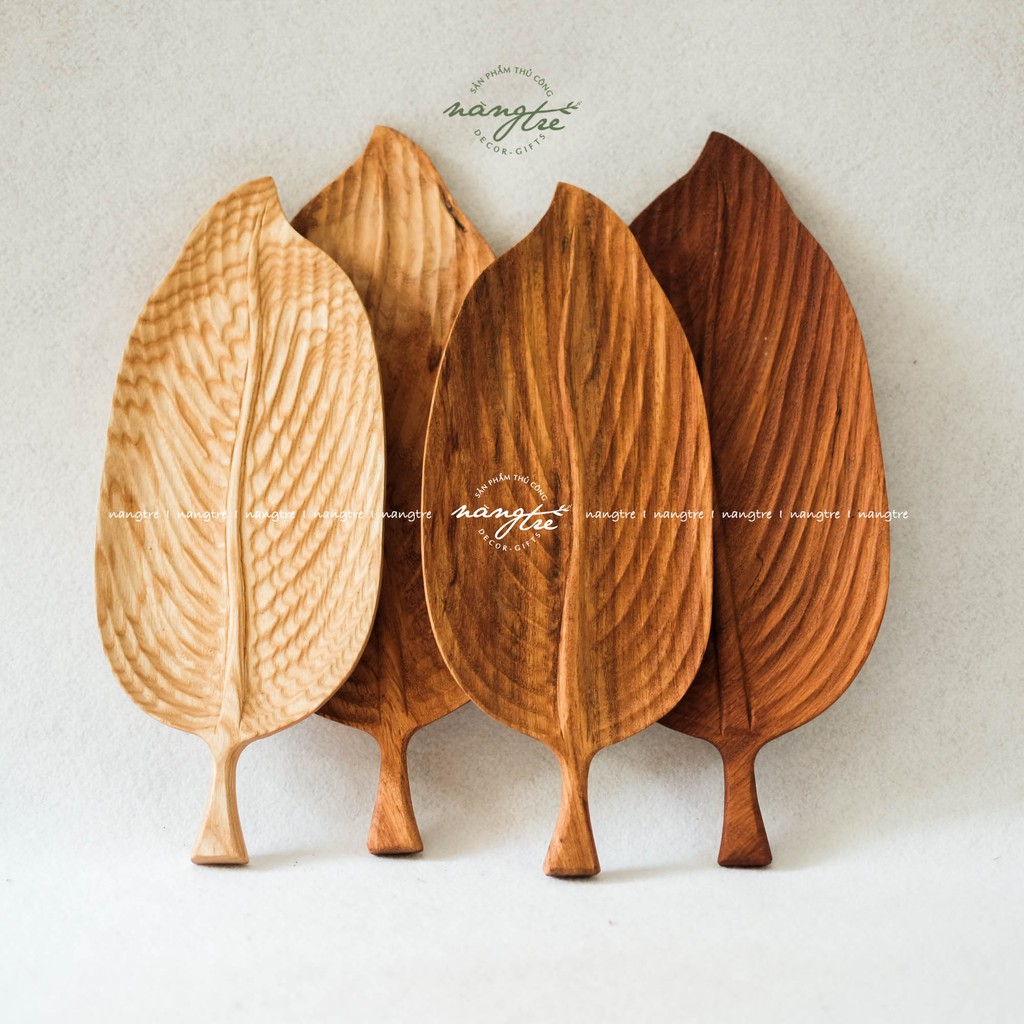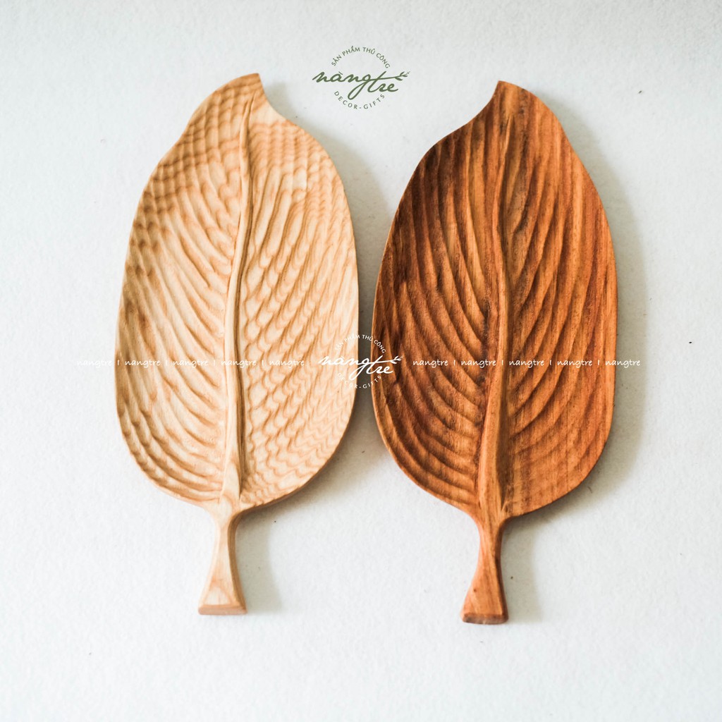 Đĩa gỗ hình lá/ Đĩa gỗ decor- Được sản xuất từ gỗ đỏ/ gỗ tần bì chất lượng, nguyên khối, có vân gỗ tự nhiên, chạm khắc độc đáo, phủ dầu oliu.