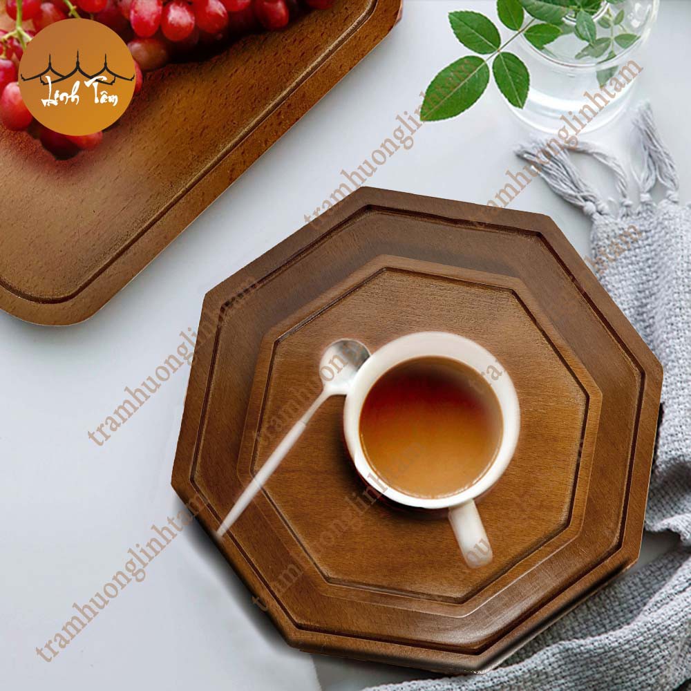 Đĩa gỗ tự nhiên nguyên khối màu nâu hình bát giác đựng trà bánh đồ ăn đĩa gỗ decor phụ kiện phòng ăn