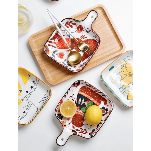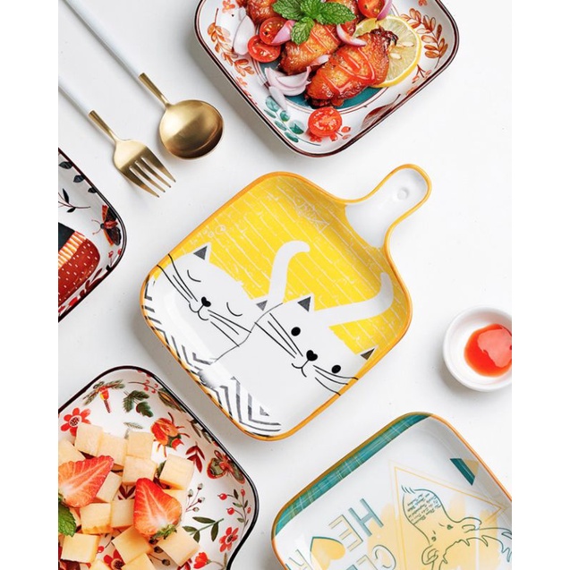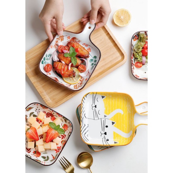 Nhà cửa & Đời sống > Bộ đồ bàn ăn > Dĩa || Đĩa gốm sứ vuông tay cầm tráng men hoạ tiết vẽ tay vintage phong cách Nhật lenhome decor phòng bếp trang trí bàn ănCòn hàng