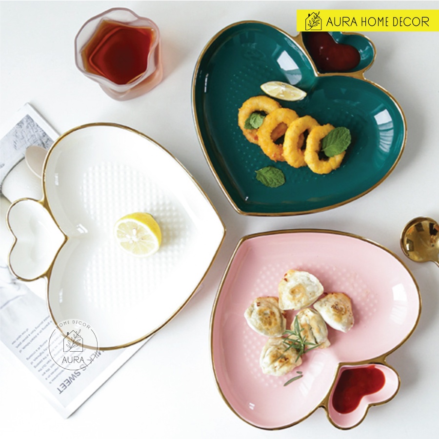 Nhà cửa & Đời sống > Bộ đồ bàn ăn > Dĩa || Đĩa hình trái tim kèm ô chia đựng sauce - Gốm sứ men bóng viền vàng - Sang chảnh 3 màu hồng, trắng, xanh cổ vịtCòn hàng