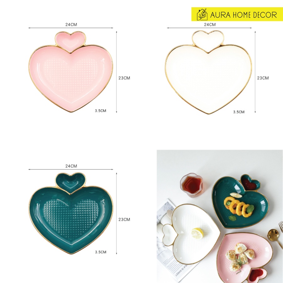 Đĩa hình trái tim kèm ô chia đựng sauce - Gốm sứ men bóng viền vàng - Sang chảnh 3 màu hồng, trắng, xanh cổ vịt