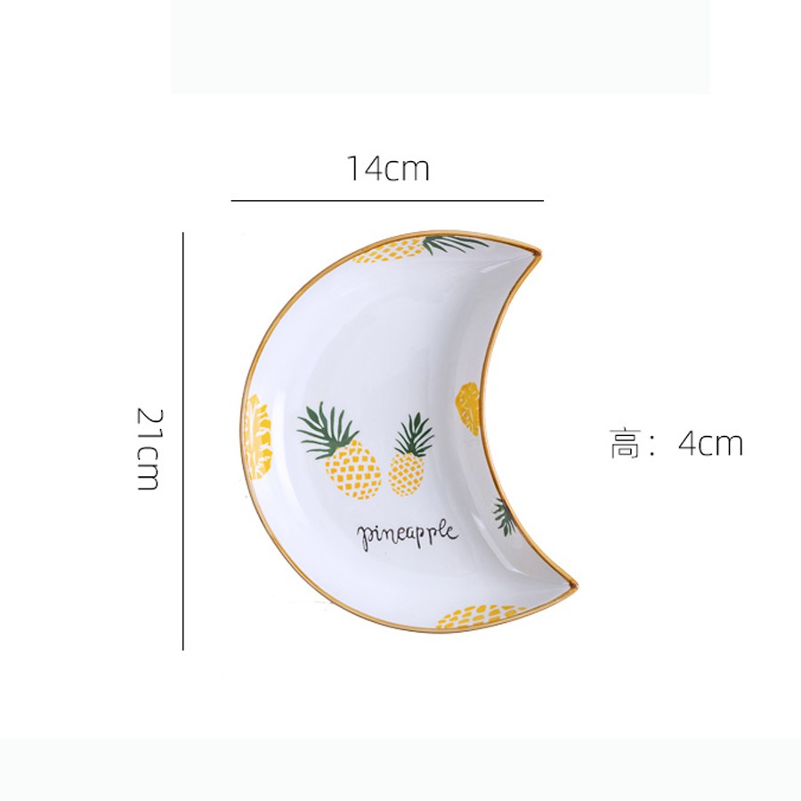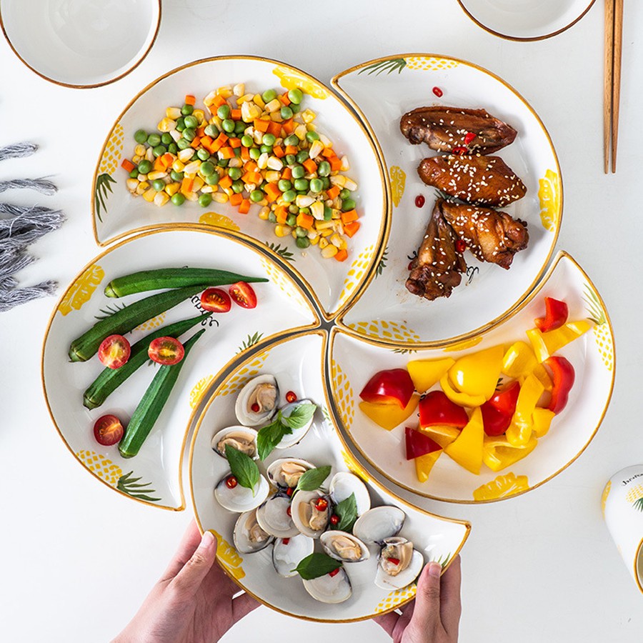 __ THÔNG TIN SẢN PHẨM:+ Đĩa hoa, sét đĩa sứ họa tiết dứa vàng xếp hình cánh hoa cao cấp có dáng trăng lưỡi liềm.Có thể sáng tạo xếp đĩa hình cánh hoa độc đáo phù hợp với bữa ăn gia đình và nhà hàng nha!