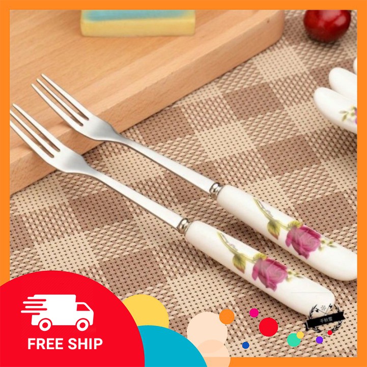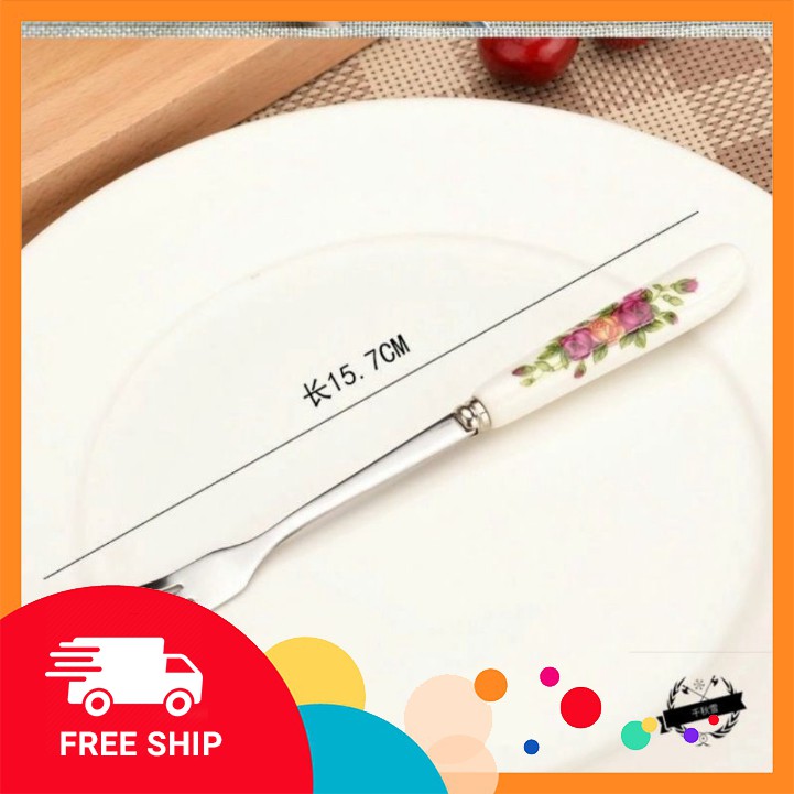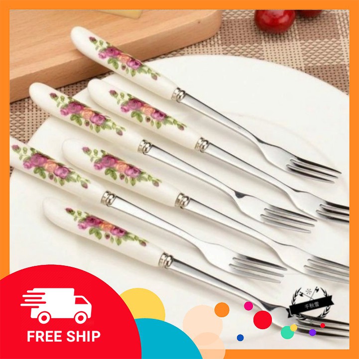 Nhà cửa & Đời sống > Bộ đồ bàn ăn > Dĩa || Dĩa inox 304, dĩa xiên thịt hoa quả cán sứ hoa văn loại xịn GDTACòn hàng
