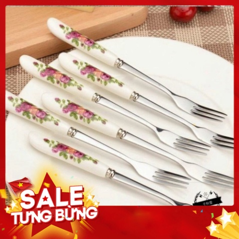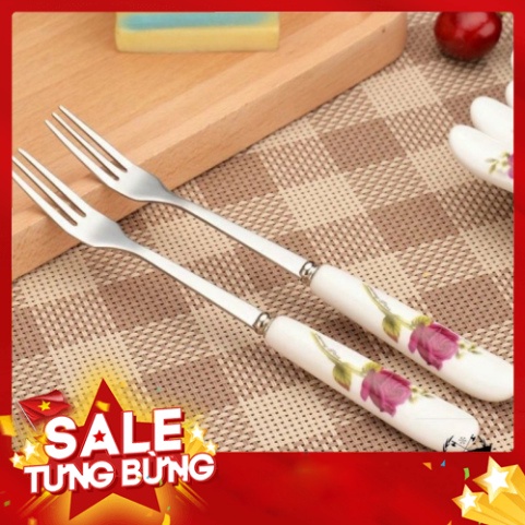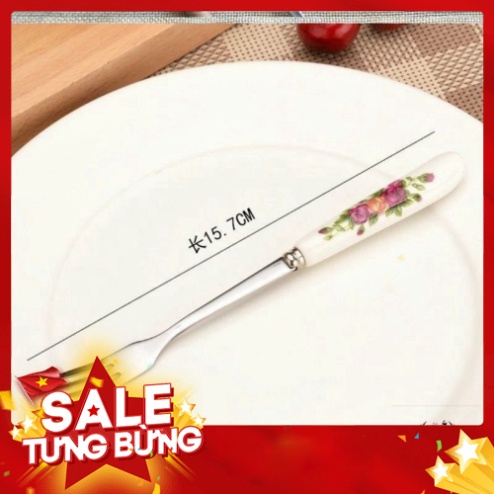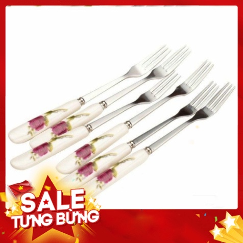 Nhà cửa & Đời sống > Bộ đồ bàn ăn > Dĩa || Dĩa inox 304, dĩa xiên thịt hoa quả cán sứ hoa văn loại xịn AMCòn hàng