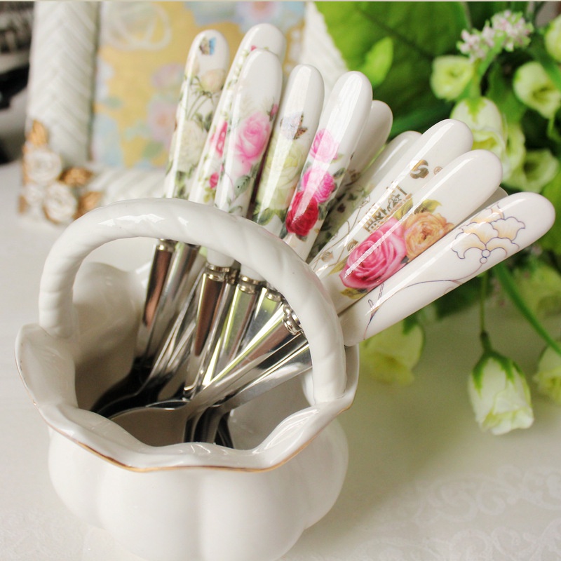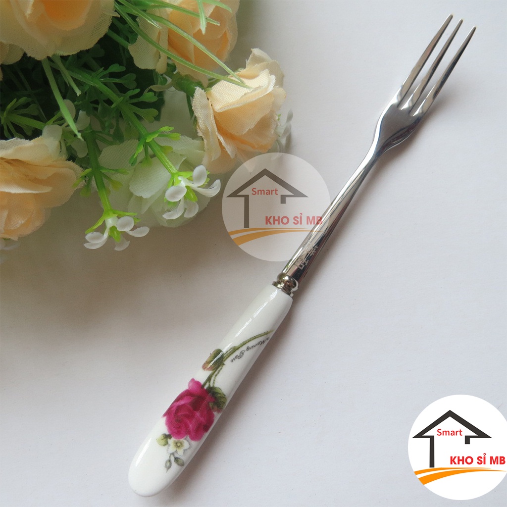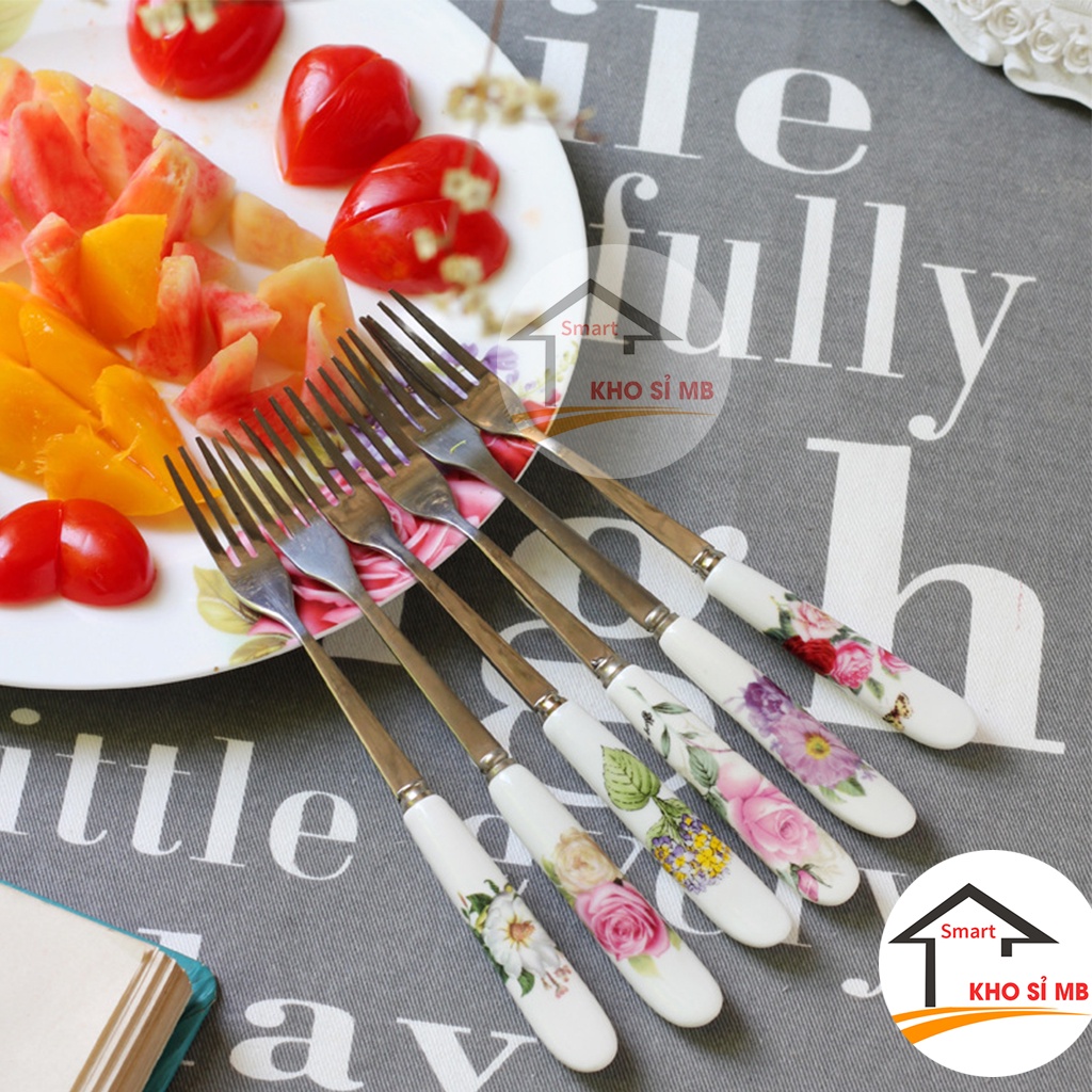 Dĩa inox cán sứ ăn hoa quả, nĩa inox cán sứ ăn trái cây hàng đẹp - kho sỉ mbDĩa inox cán sứ ăn hoa quả, nĩa inox cán sứ ăn trái cây hàng đẹp được sản xuất từ chất liệu inox không từ tính, có khả năng chịu nhiệt cao nên dù sử dụng nước nóng hay nước lạnh sản phẩm cũng không tạo ra những chất độc hai gây ảnh hưởng cho sức khoẻ. Sản phẩm có kích thước vừa vặn, thuận tiện sử dụng. Đặc biệt phần cán cầm khá độc đáo, được bọc cán sứ có in hoa văn, không trầy xước, đẹp mắt.