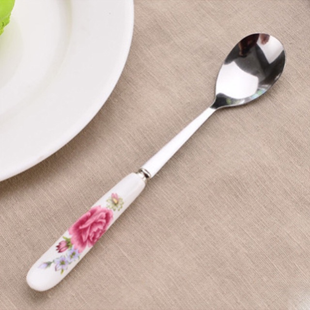 Dĩa inox cán sứ hoa hồng cao cấp loại 1