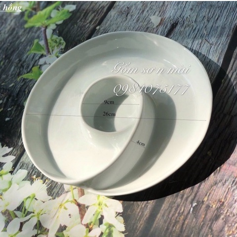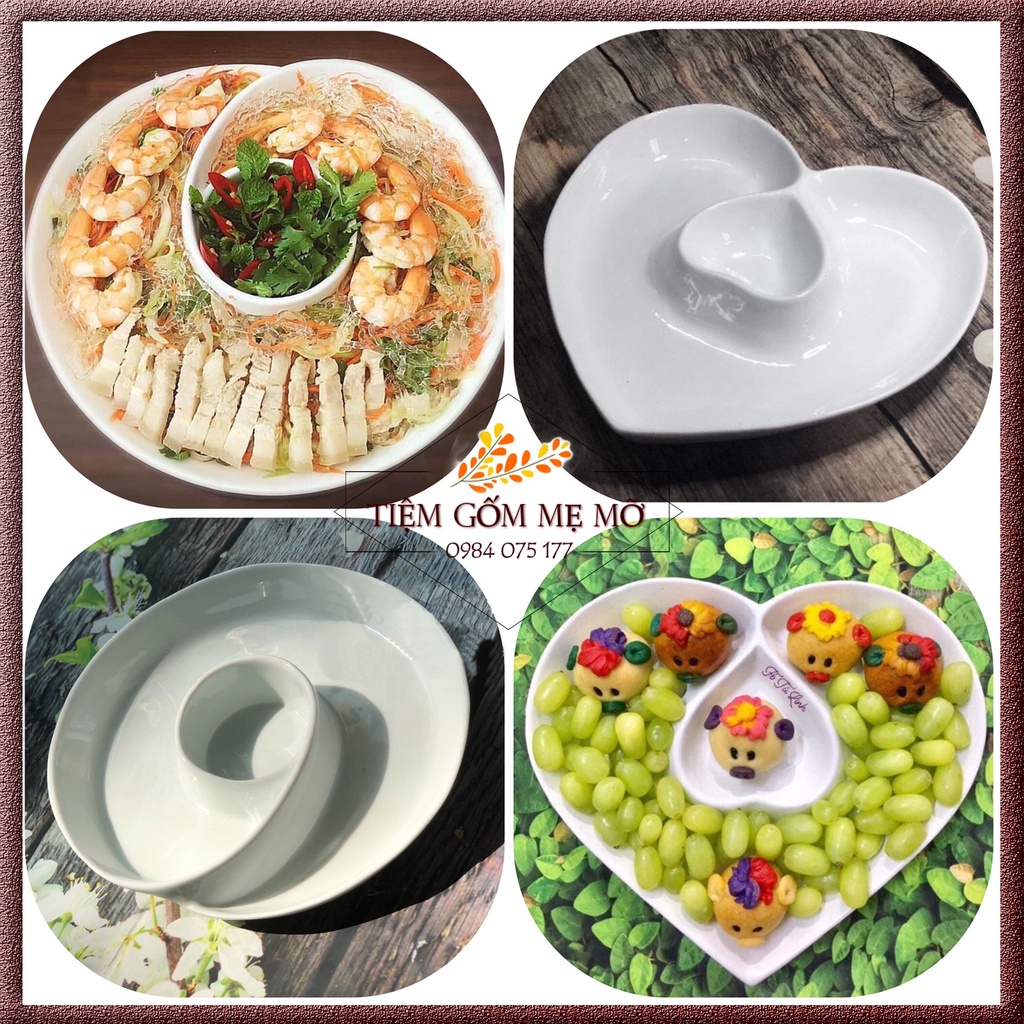 Đĩa Khay bày đồ ăn trang trí thức ăn kèm ngăn gia vị nước chấm men trắng gốm sứ Bát Tràng