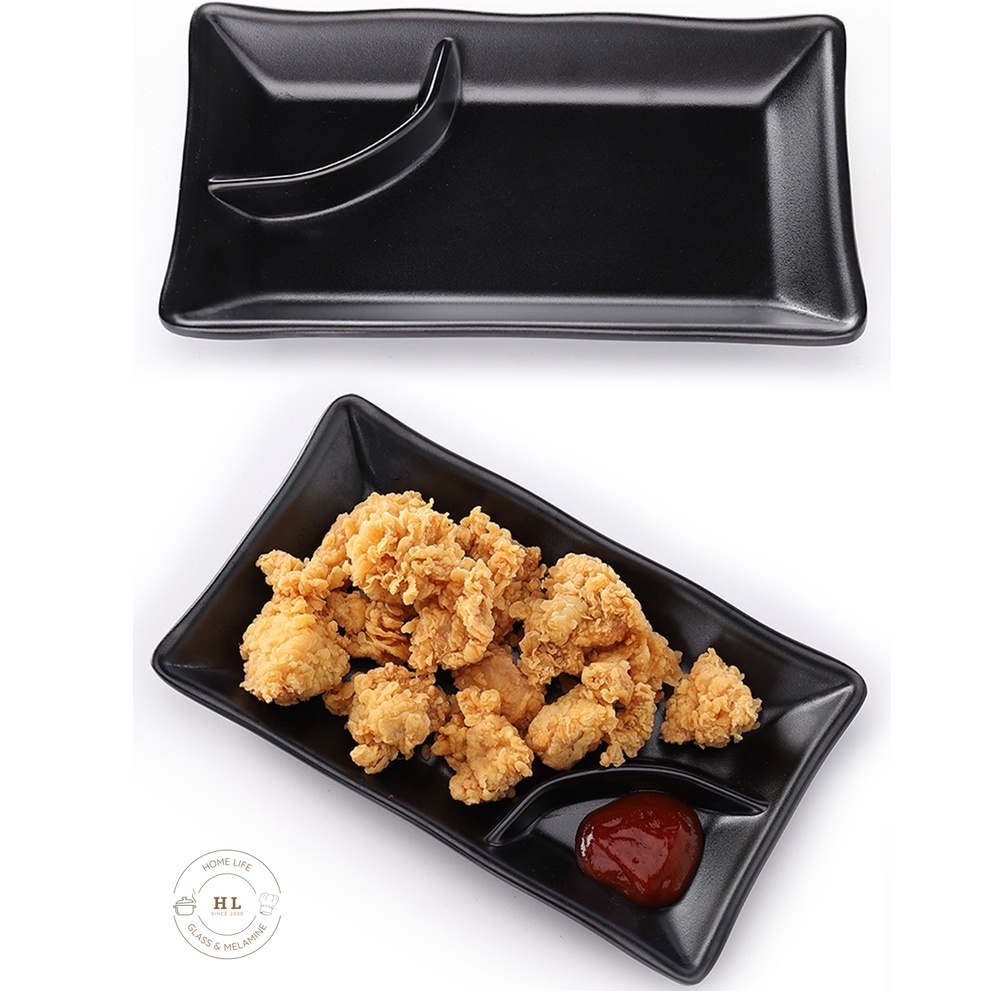 ĐĨA MELAMINE ĐEN A301 3111 CHỊU NHIỆT CÓ KHAY CHẤM CHO NHÀ HÀNG CAO CẤP | ĐĨA CHỮ NHẬT ĐEN NHÁM CHIA NGĂN MELAMINE A5