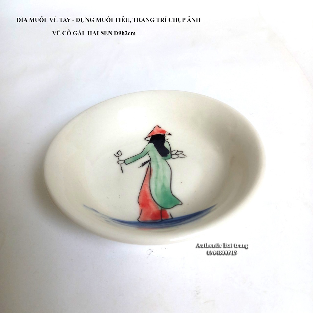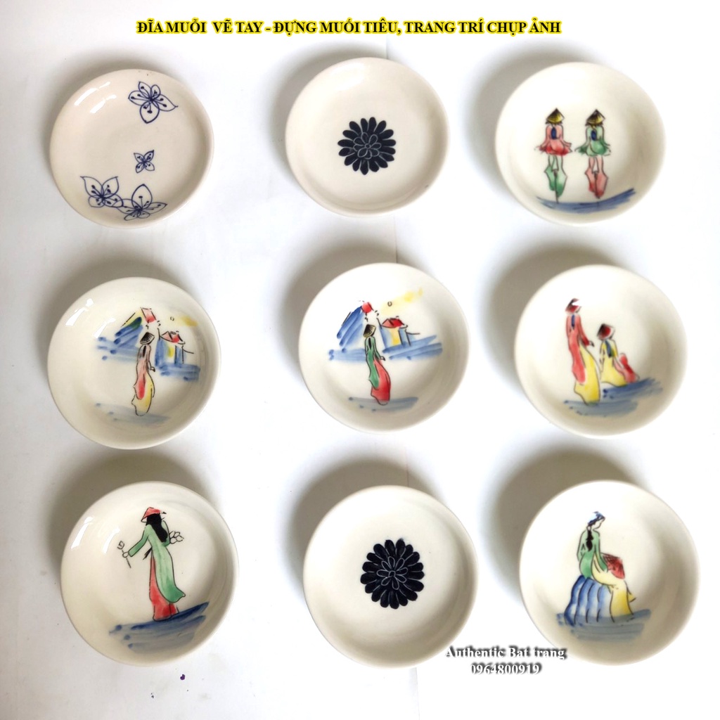 Đĩa muối D9h2 vẽ tay- Đựng muối tiêu, gia vị , trang trí chụp ảnh rất tuyệt vời - gốm sứ authentic bat trang