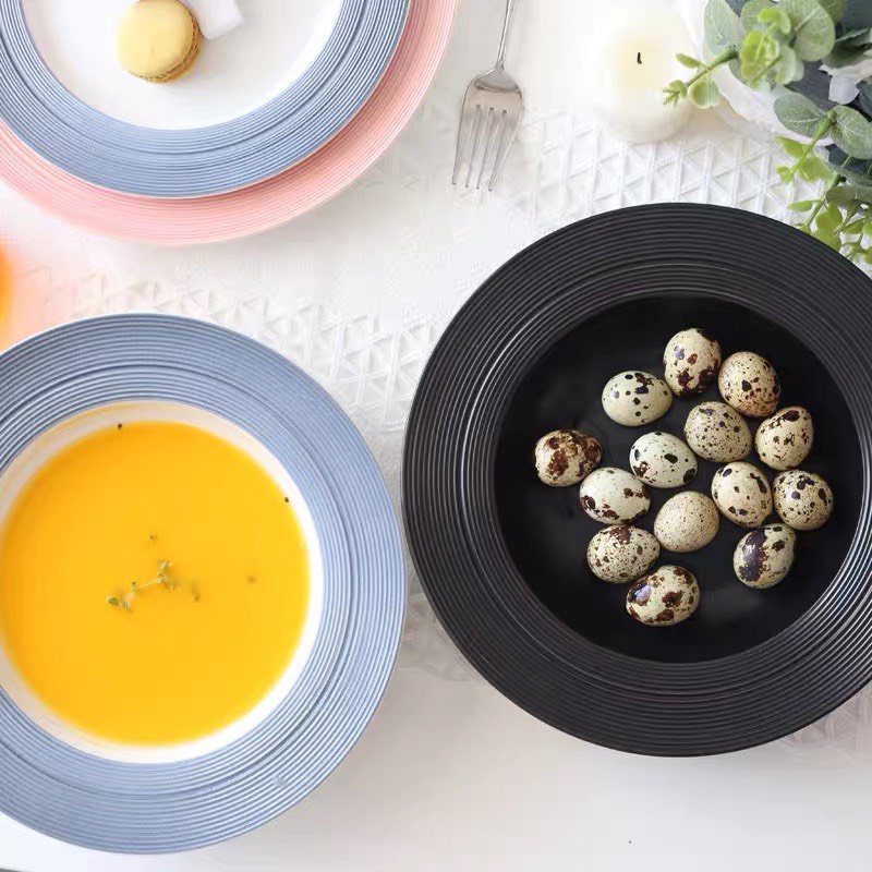 Nhà cửa & Đời sống > Bộ đồ bàn ăn > Dĩa || Đĩa nhà hàng phong cách Bắc Âu sang trọng, kiểu dáng phẳng và sâu lòng trắng viền xanh, nhẹ nhàng tinh tế, sang trọngCòn hàng