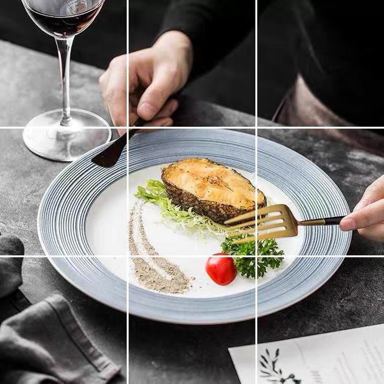 Giới thiệu Đĩa nhà hàng phong cách Bắc Âu sang trọng, kiểu dáng phẳng và sâu lòng trắng viền xanh, nhẹ nhàng tinh tế, sang trọng