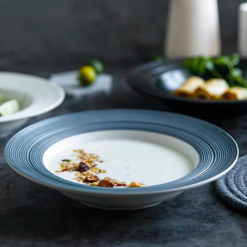 Đĩa nhà hàng phong cách Bắc Âu sang trọng, kiểu dáng phẳng và sâu lòng trắng viền xanh, nhẹ nhàng tinh tế, sang trọng