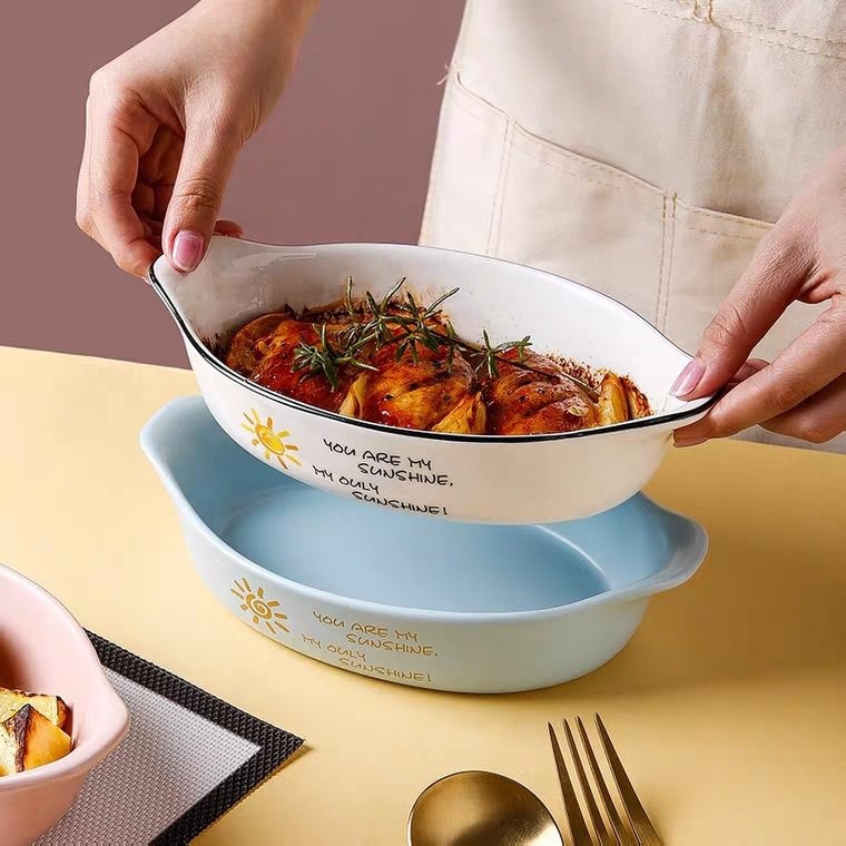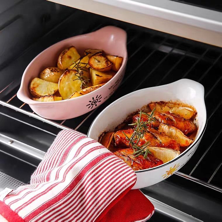 ▪️Chất liệu: gốm sứ, hoa văn vintage vẽ tay, có tay cầm 2 bên giúp dễ lấy đồ khỏi lò nướng/nồi chiên.