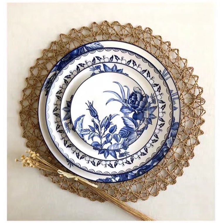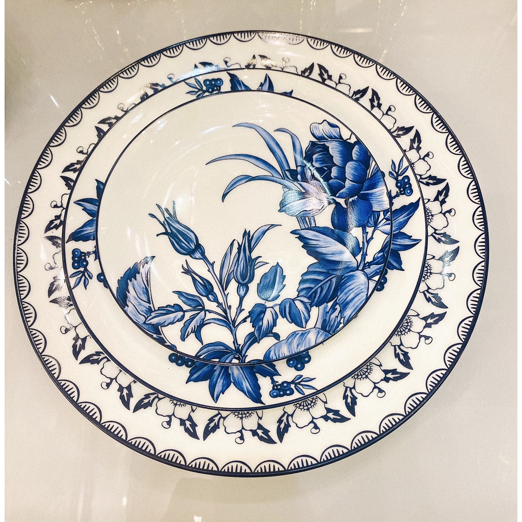 Giới thiệu Đĩa phong cách Bắc Âu sang trọng, viền vàng, ăn tiệc cao cấp, để salad, ăn chính, họa tiết hoa hồng xanh tinh tế