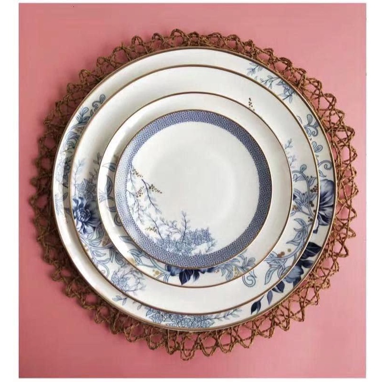 Giới thiệu Đĩa phong cách Bắc Âu sang trọng, viền vàng, ăn tiệc cao cấp, để salad, ăn chính, họa tiết hoa hồng xanh tinh tế