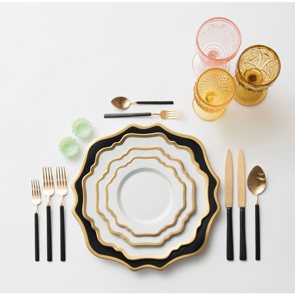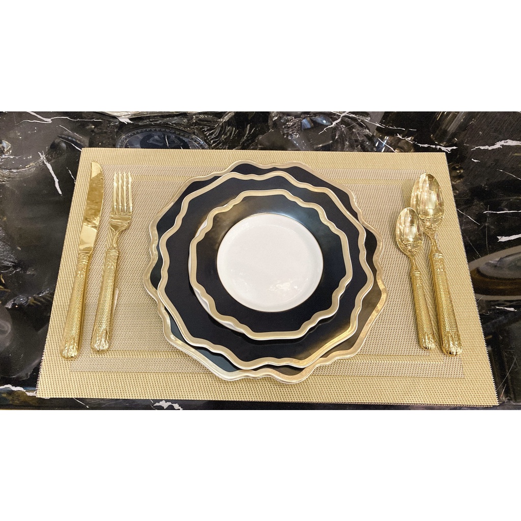Đĩa phong cách Bắc Âu sang trọng, viền vàng, bát đĩa ăn tiệc cao cấp, đĩa salad, đĩa chính, đĩa đen độc lạ