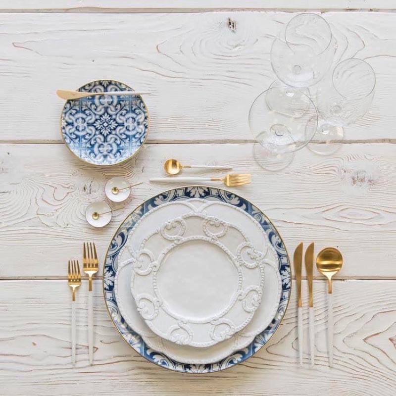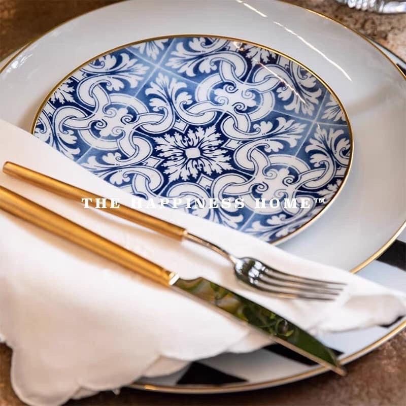 Đĩa phong cách Bắc Âu sang trọng, viền vàng, bát đĩa ăn tiệc cao cấp, đĩa salad, đĩa chính, đĩa họa tiết xanh tinh tế