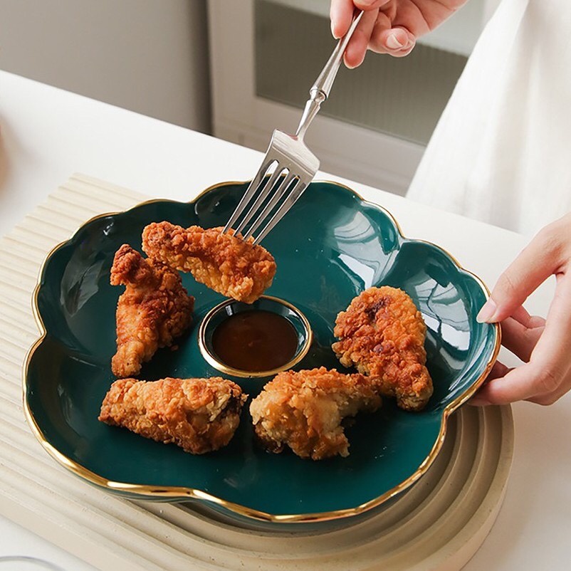 Đĩa sứ chia ngăn | Đĩa chia ngăn đựng nước chấm , gia vị chất liệu sứ kẻ vàng kim hình trái tim - hình hoa Decor 2022Chất liệu: Sứ sương