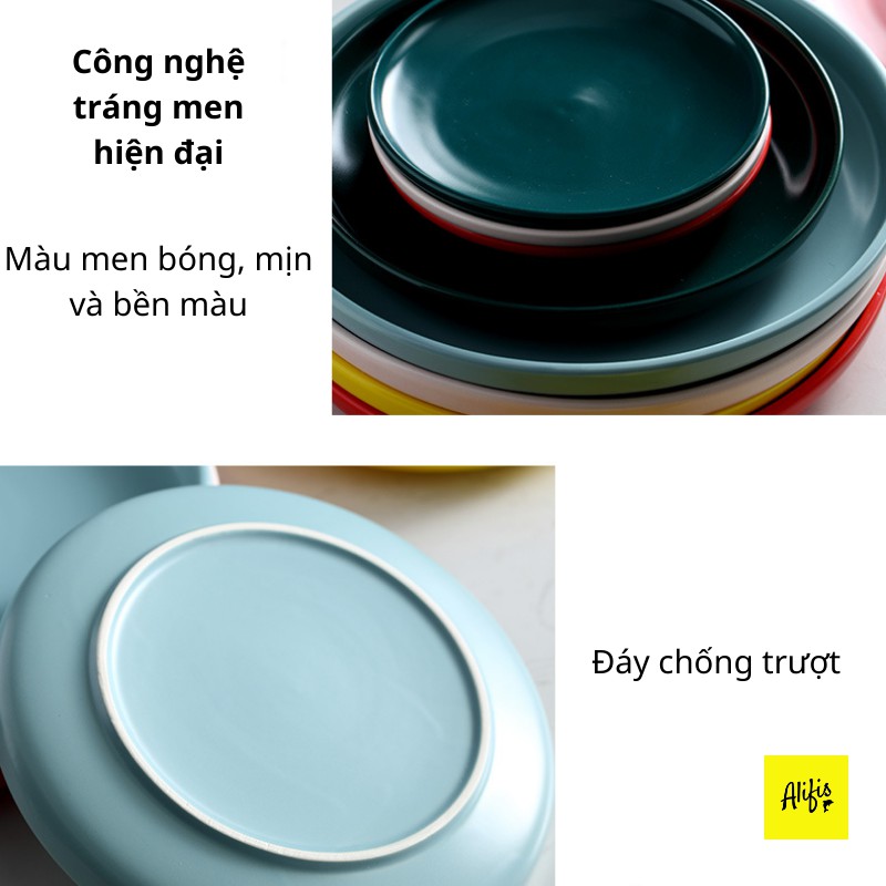 + Đĩa được làm từ chất liệu gốm cao cấp, chịu nhiệt tốt, tráng men màu không chì, an toàn cho sức khỏe